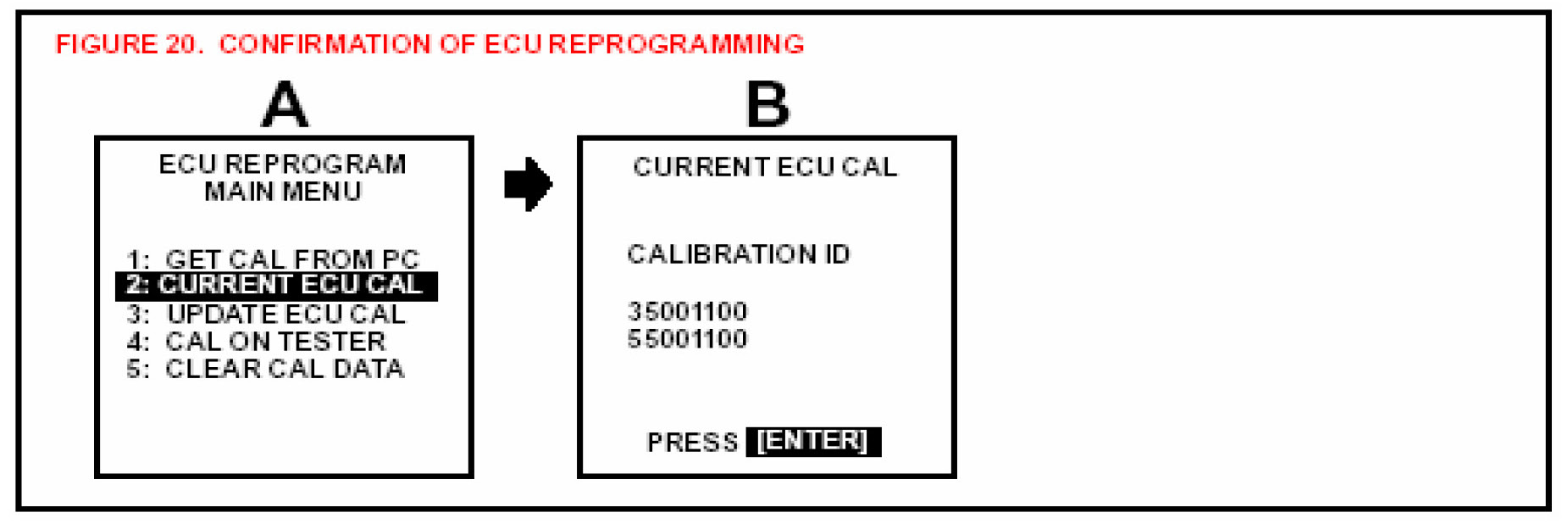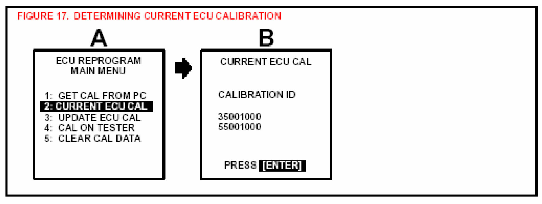 A. Connect the Diagnostic Tester to the vehicle and select CURRENT ECU CAL from the ECU REPROGRAM MAIN MENU. Determine the vehicle's current ECU calibration. (See Figure 17.)