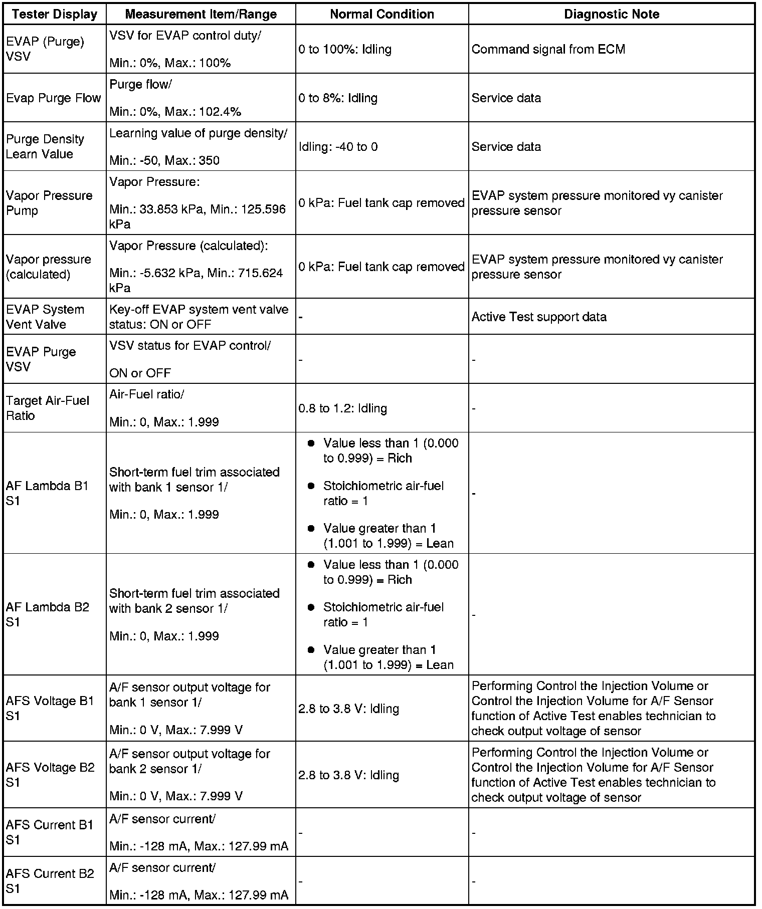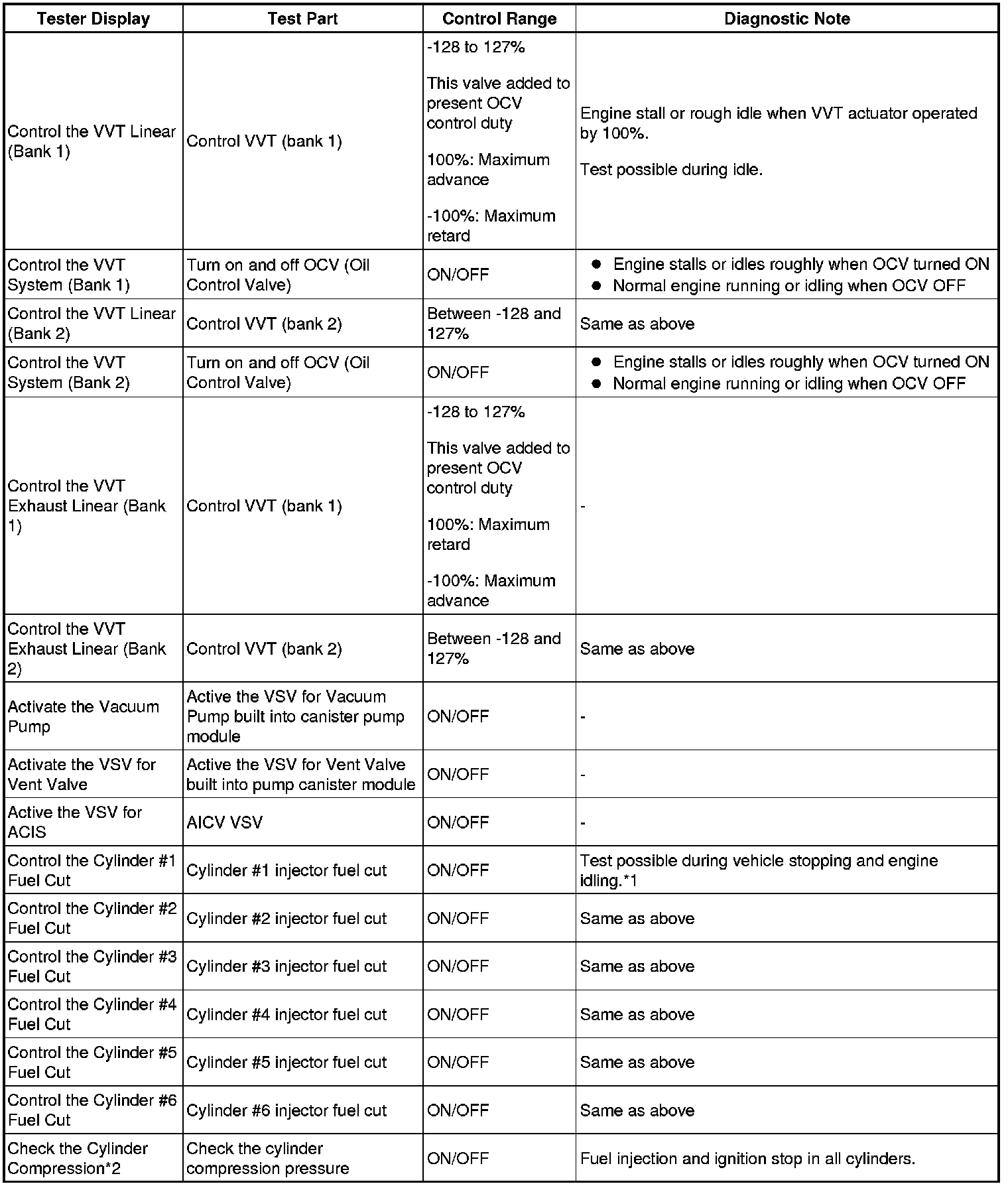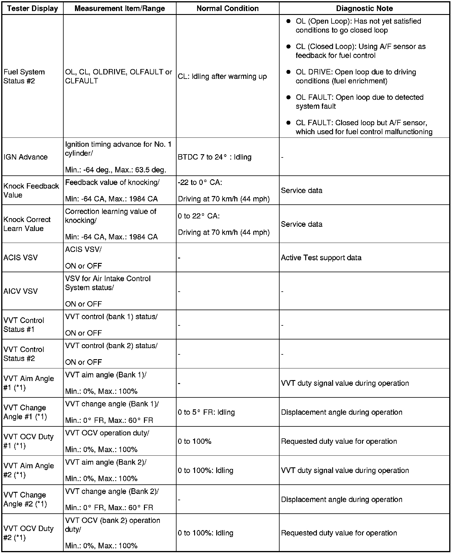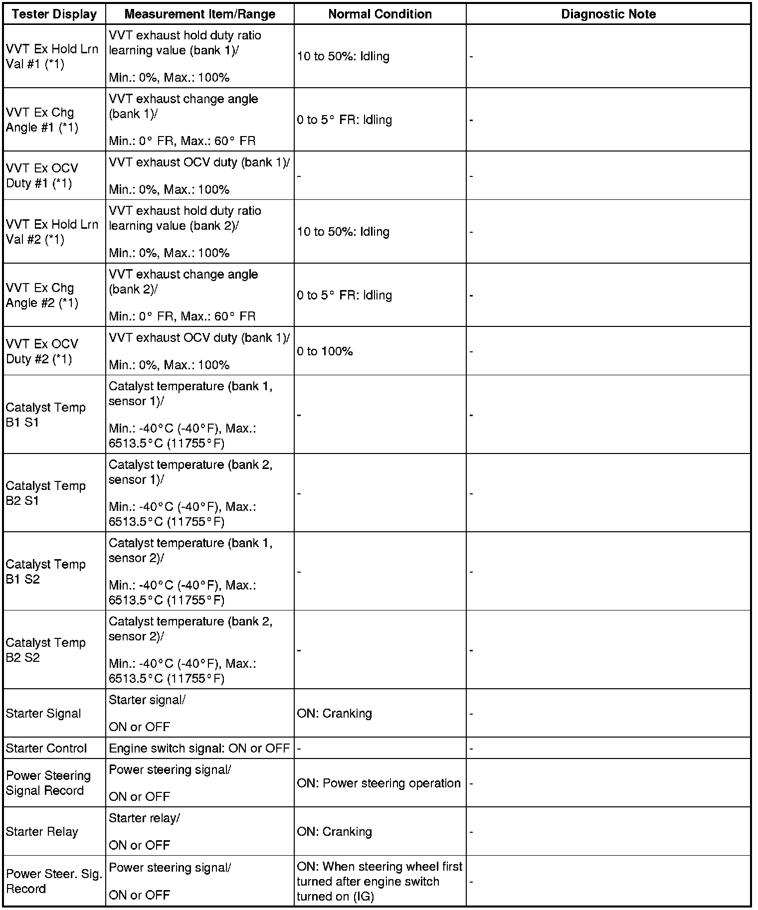 - *: Data List values are displayed only when performing the following Active Test: Control the VVT Linear (Bank 1 or Bank 2) or Control the VVT Exhaust Linear (Bank 1 or Bank 2). For other Active Test, the Data List value will be 0.