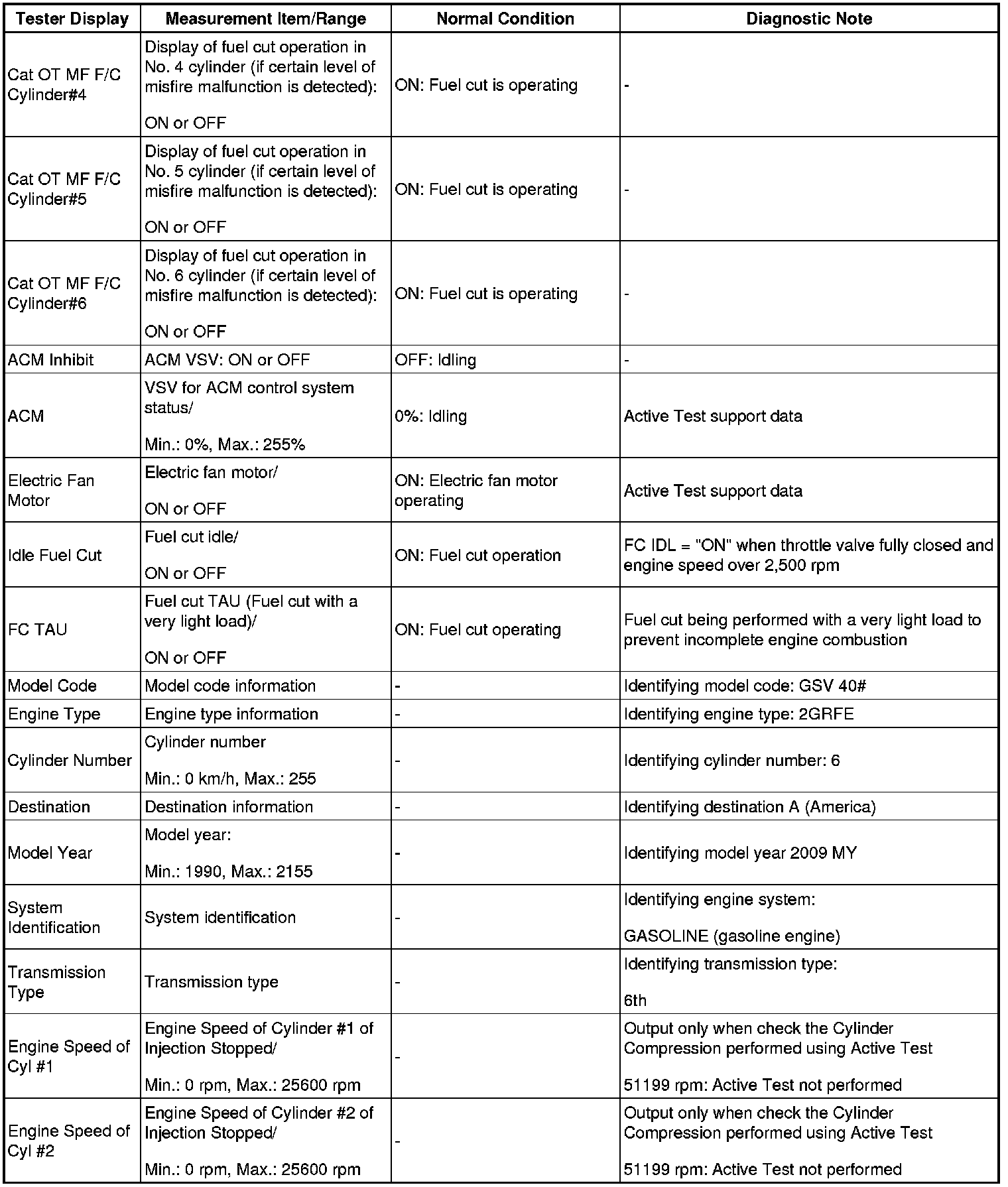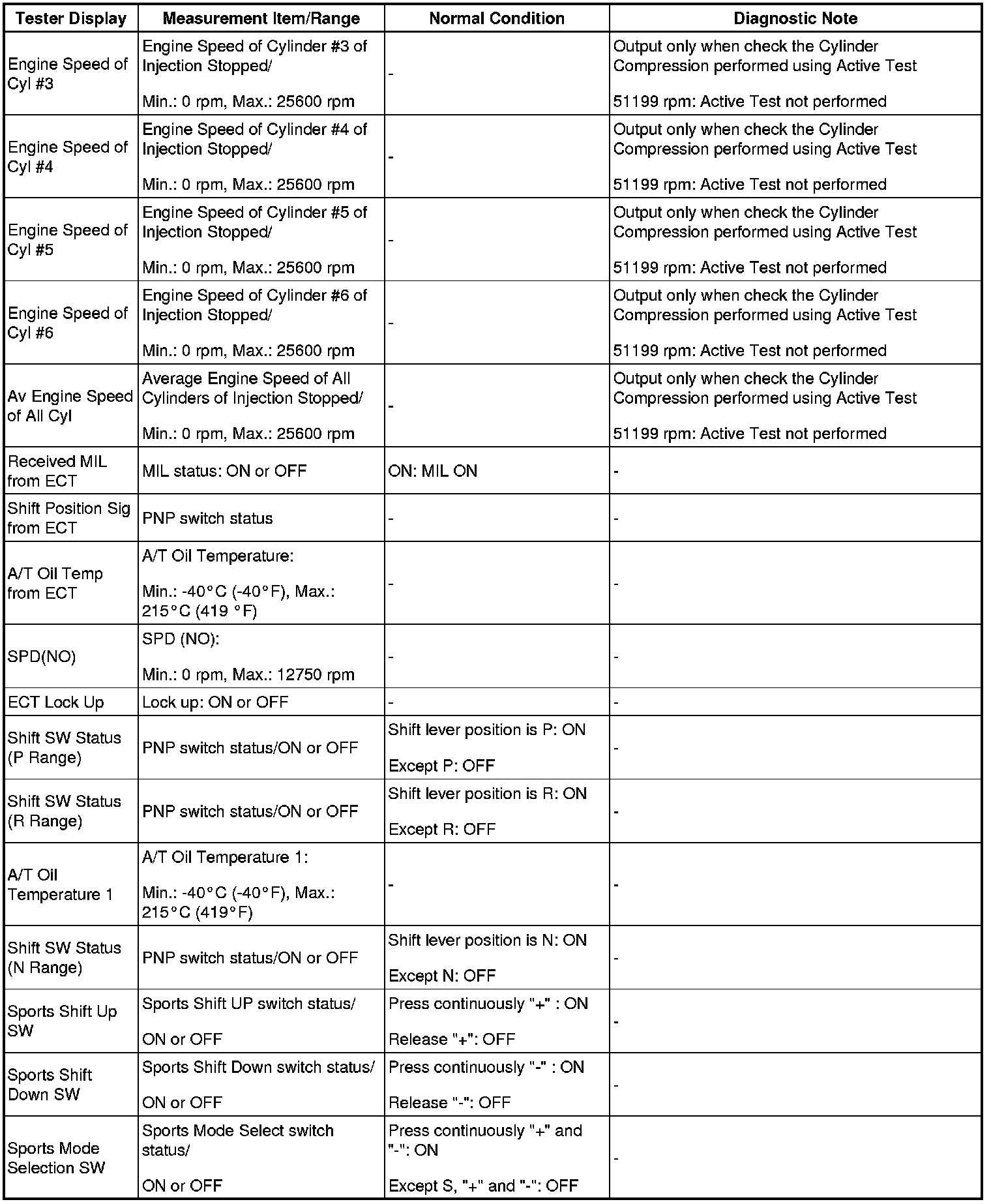 HINT: *2: While the Active Test item check the Cylinder Compression is being performed, the fuel and ignition of all cylinders is cut. At this time, the ECM measures the speed of each cylinder while the engine is being cranked.