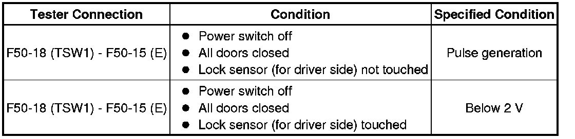 If the driver door entry unlock function operates normally, but its entry lock function does not, this means that the request code from the driver door is being output normally. In this case, a malfunction in the lock sensor circuit (from the certification ECU (smart key ECU assembly) to the front door outside handle assembly (lock sensor)) is suspected.