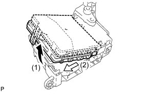 (d) Raise the main body ECU as shown by the arrow (1), and then pull it out as shown by the arrow (2) shown in the illustration.