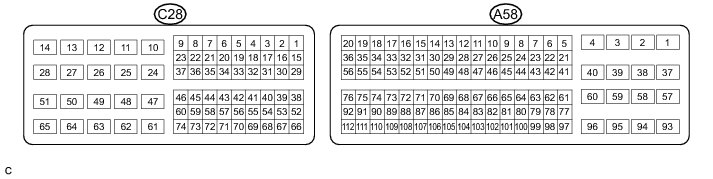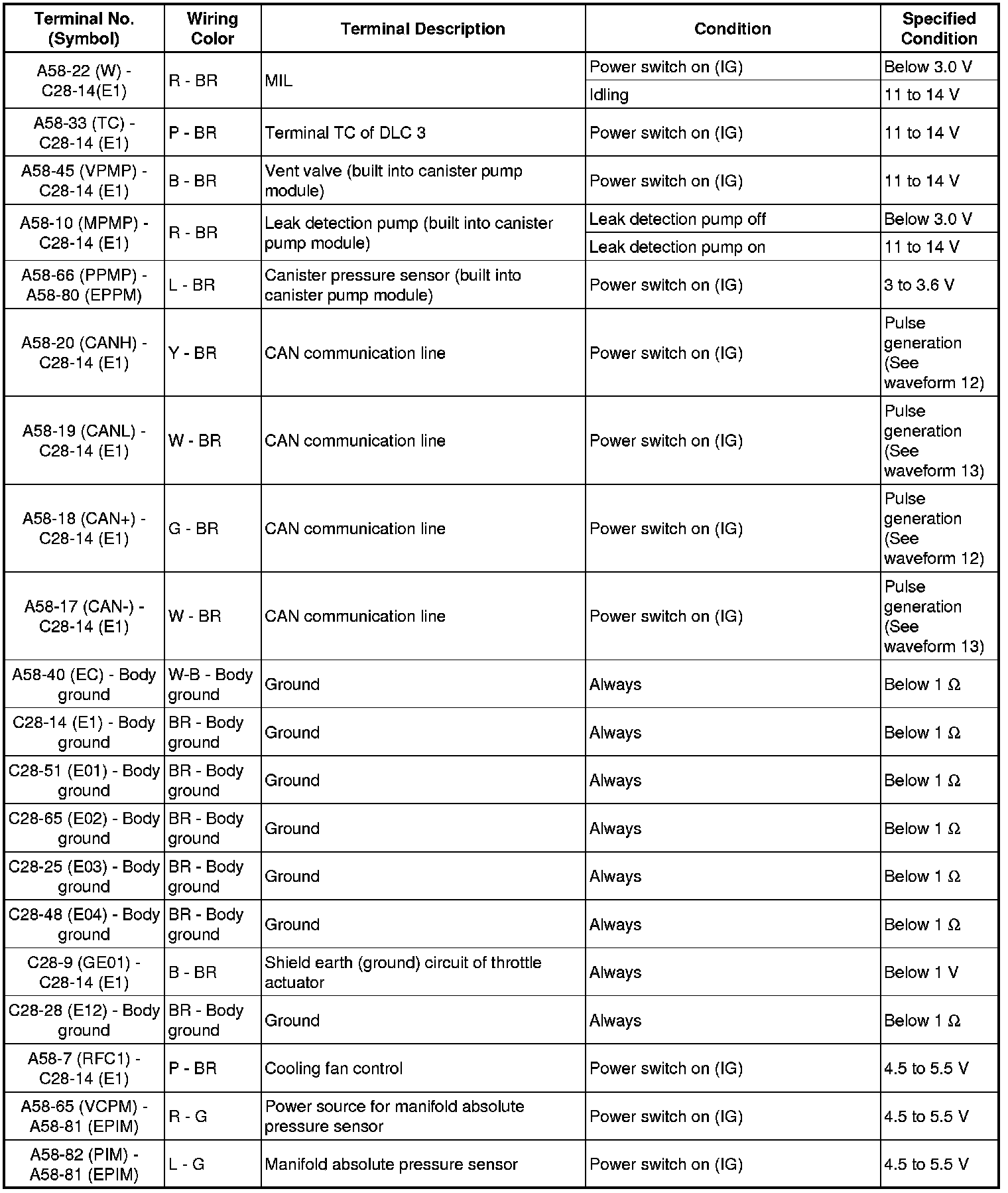 The standard normal voltage between each pair of the ECM (included in the hybrid vehicle control ECU) terminals is shown in the table below. The appropriate conditions for checking each pair of the terminals are also indicated. The result of checks should be compared with the standard normal voltage for that pair of the terminals, displayed in the "Specified Condition" column. The illustration above can be used as a reference to identify the hybrid vehicle control ECU terminal locations.