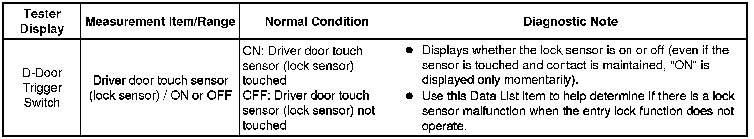 If the entry lock function does not operate for the driver door only, but the entry unlock function operates, the request code is being transmitted properly from the driver door. In this case, there may be a problem related to the front door outside handle assembly (for driver door) (lock sensor) (connection between the certification ECU (smart key ECU assembly) and front door outside handle assembly (for driver door) [lock sensor]).