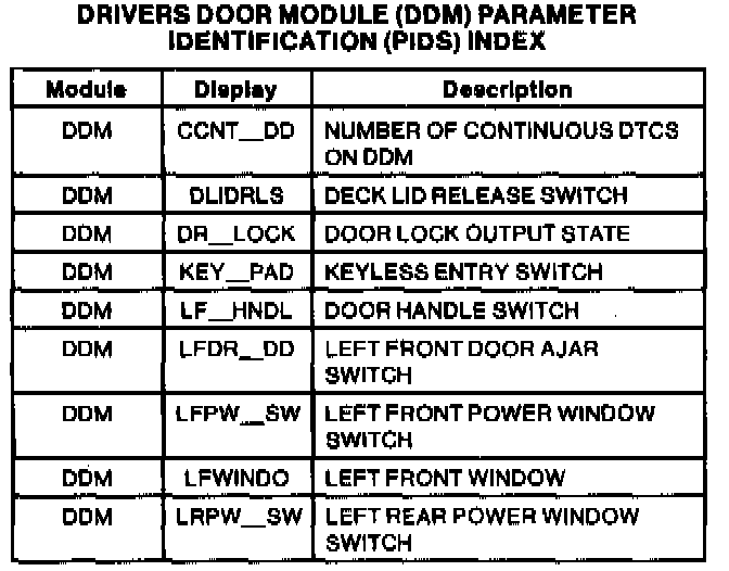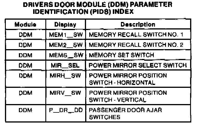 Driver Door Module (DDM) Parameter Identification (PID) Index