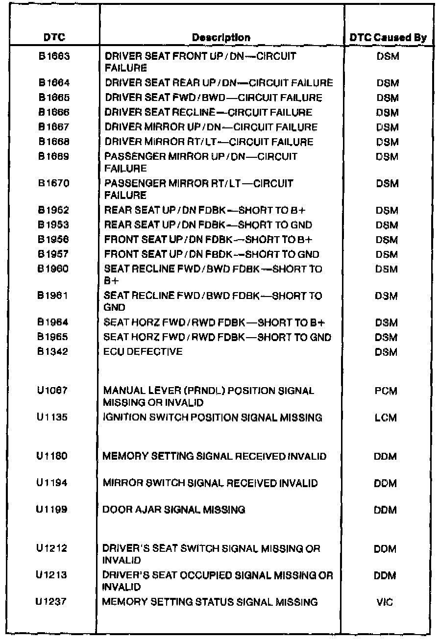 Driver Seat Module (DSM) Diagnostic Trouble Code (DTC) Index