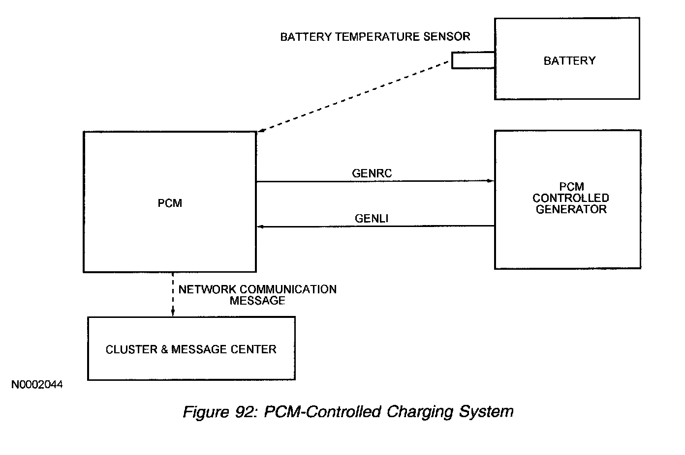 The PCM-controlled charging system provides many additional benefits over the current integral generator regulator system. The first benefit is improved battery life. In an integral generator regulator system, the regulator set point is established by a temperature sensor in the regulator which estimates battery temperature. In a PCM-controlled charging system, the regulator voltage set point is determined by the PCM and communicated to the regulator through the generator regulator control (GENRC) circuit. The PCM uses an algorithm to estimate battery temperature. Improving battery temperature estimates reduces battery damage caused by over- and undercharging.