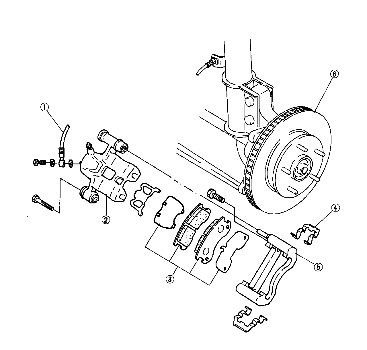 1. Flexible hose 2. Caliper assembly 3. Pad and shim 4. Guide plate 5. Mounting support 6. Disc plate