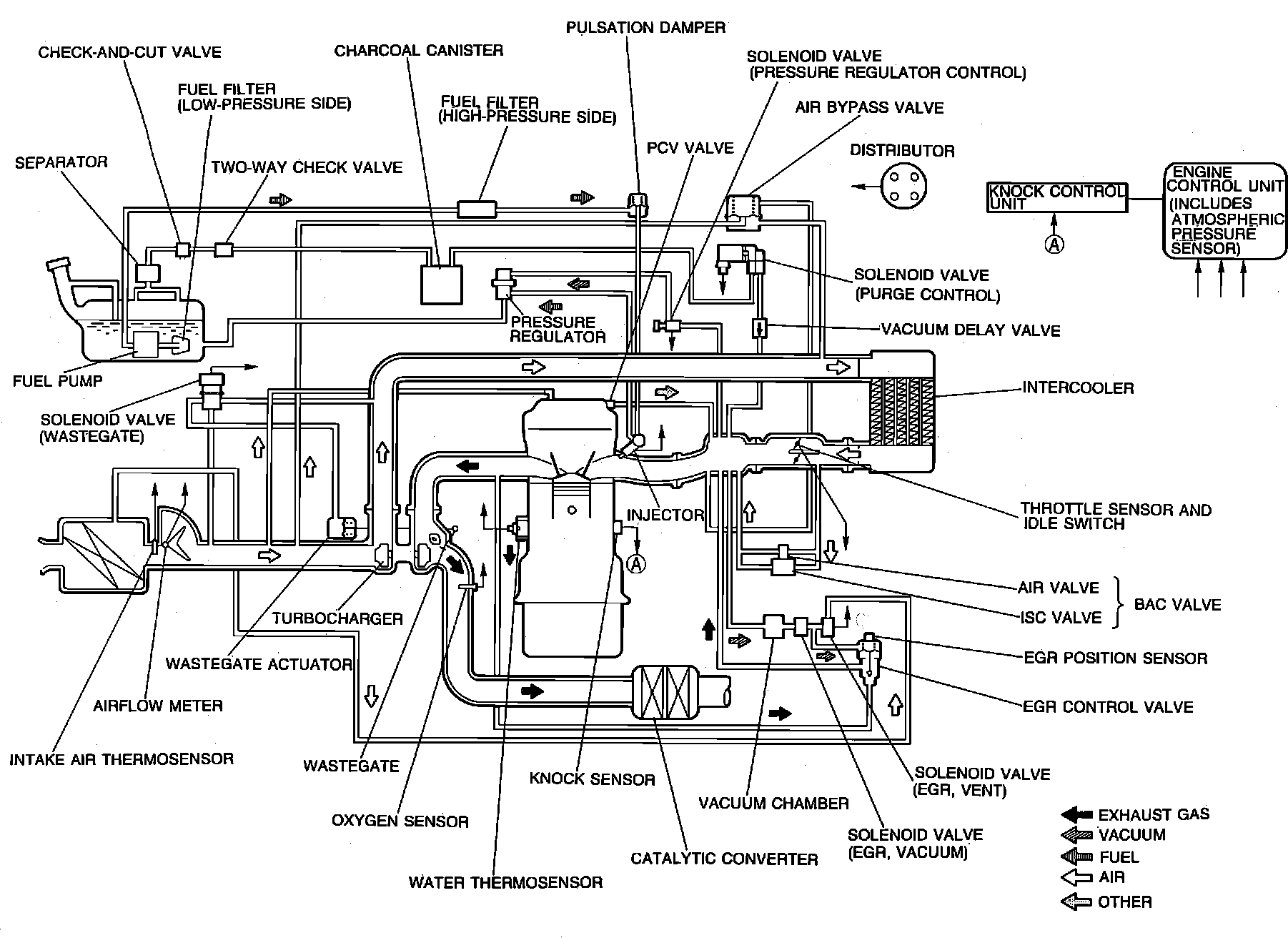 The Engine Control Unit (ECU) is the central component of this computerized fuel, ignition and emission control system. To maintain fuel economy, good driveability and reduced vehicle emissions, the ECU monitors data from various sensors and controls functions such as the fuel injection system (air/fuel ratio), emission control devices and on-board diagnostics. The EGI system also incorporates computerized controls for the turbocharger, including a knock sensor, knock control unit and wastegate solenoid valve.