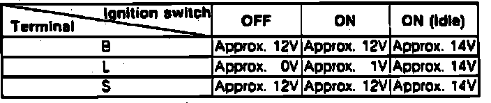 4. If below 14.1V, turn ignition "ON" with all electrical loads off and brake pedal released. Check that terminal S reads battery voltage. If okay, check for IC regulator malfunction.