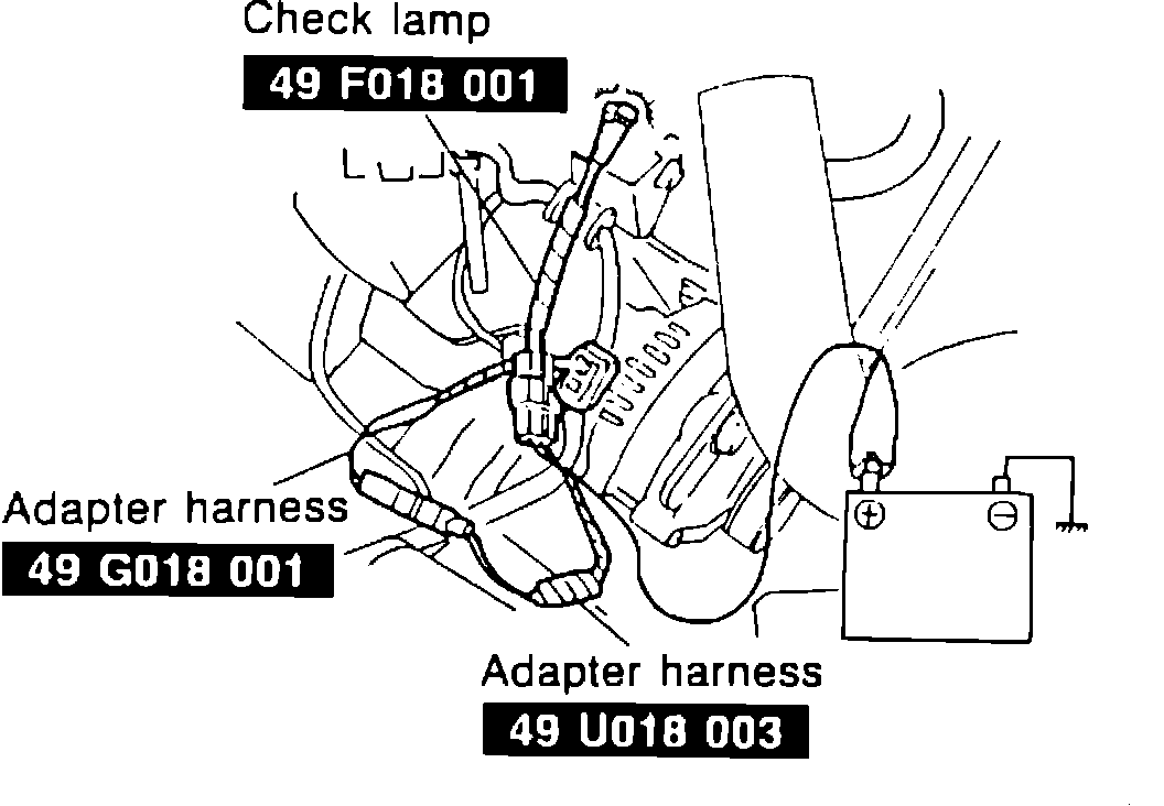 2. If other lamps are okay, disconnect alternator 2-pin connector. Hook up SST (or equivalent) as shown. Connect red adapter harness clip to battery positive. Verify that red and green lights illuminate. Start engine and check that both lights go off.