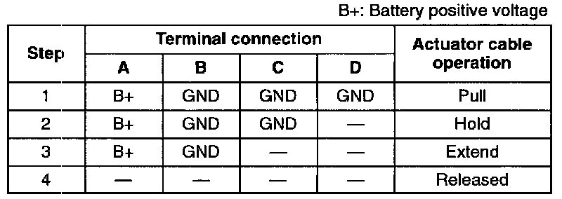 3. Connect the battery positive voltage and verify the operation of the actuator cable as indicated below.