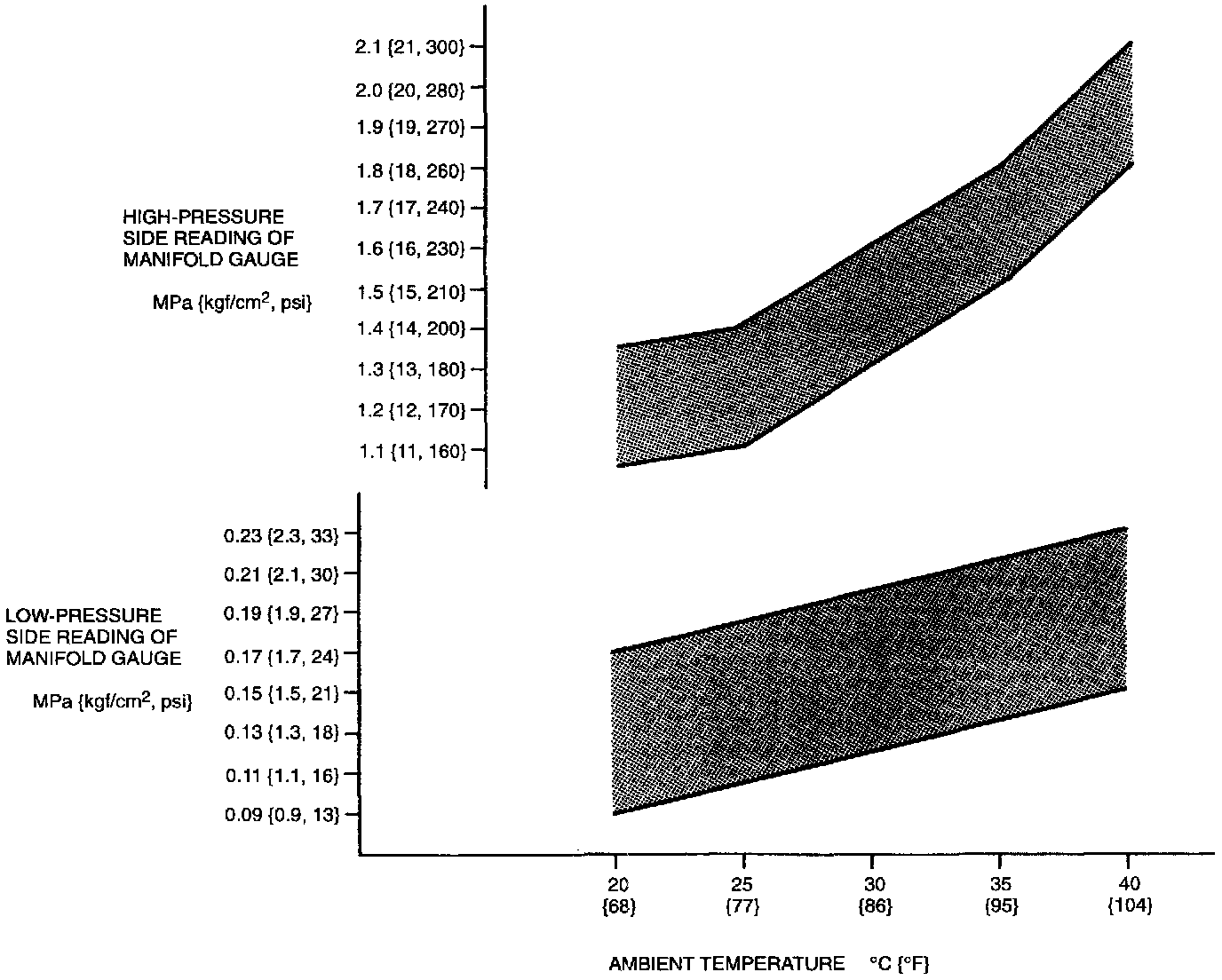 7. If the high and low pressure side readings are in the shaded zone shown in the figure, the refrigerant system is normal. If the pressures are abnormal, refer to flowchart No.27 and troubleshoot the system.