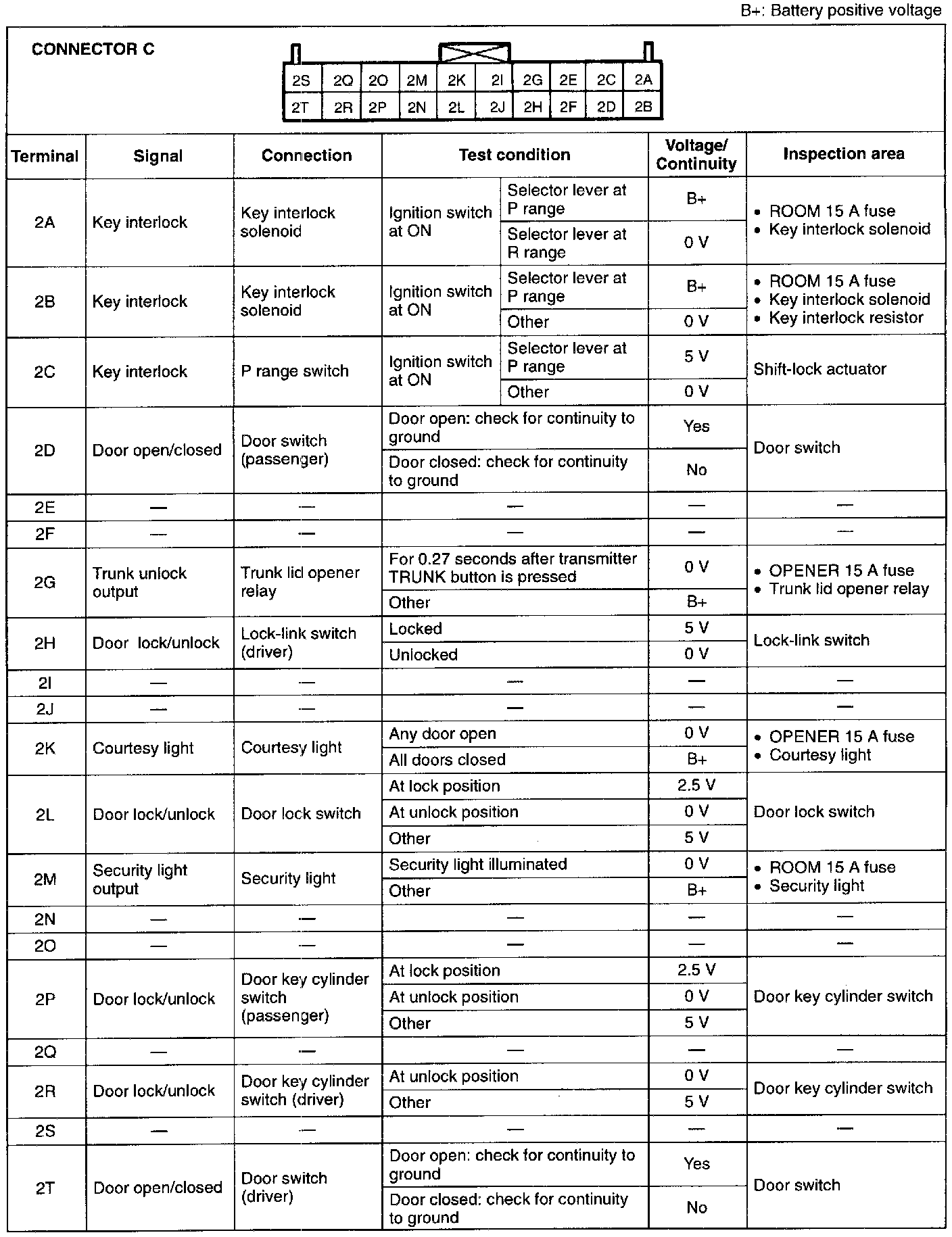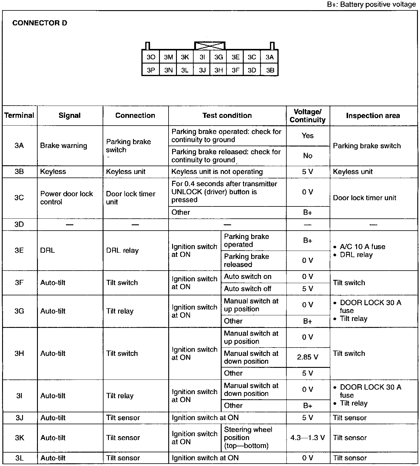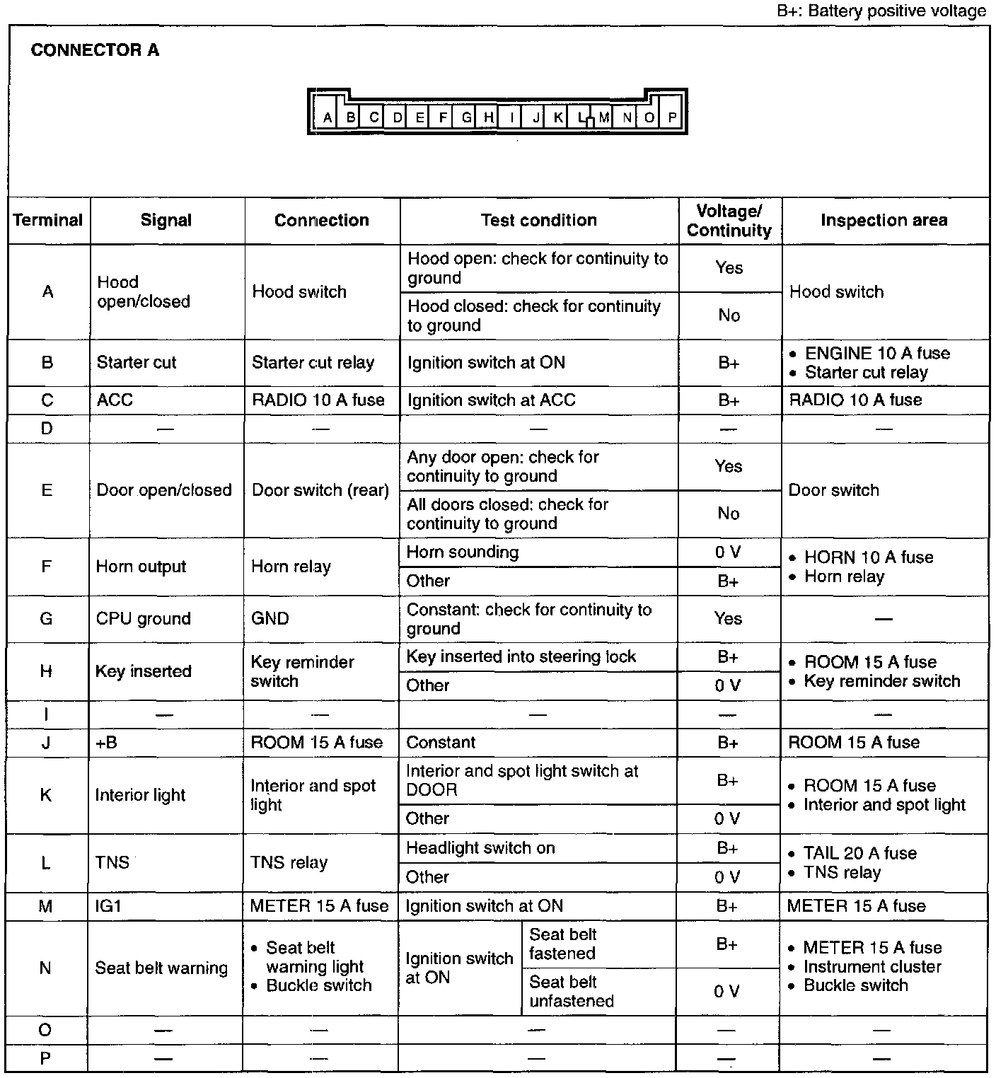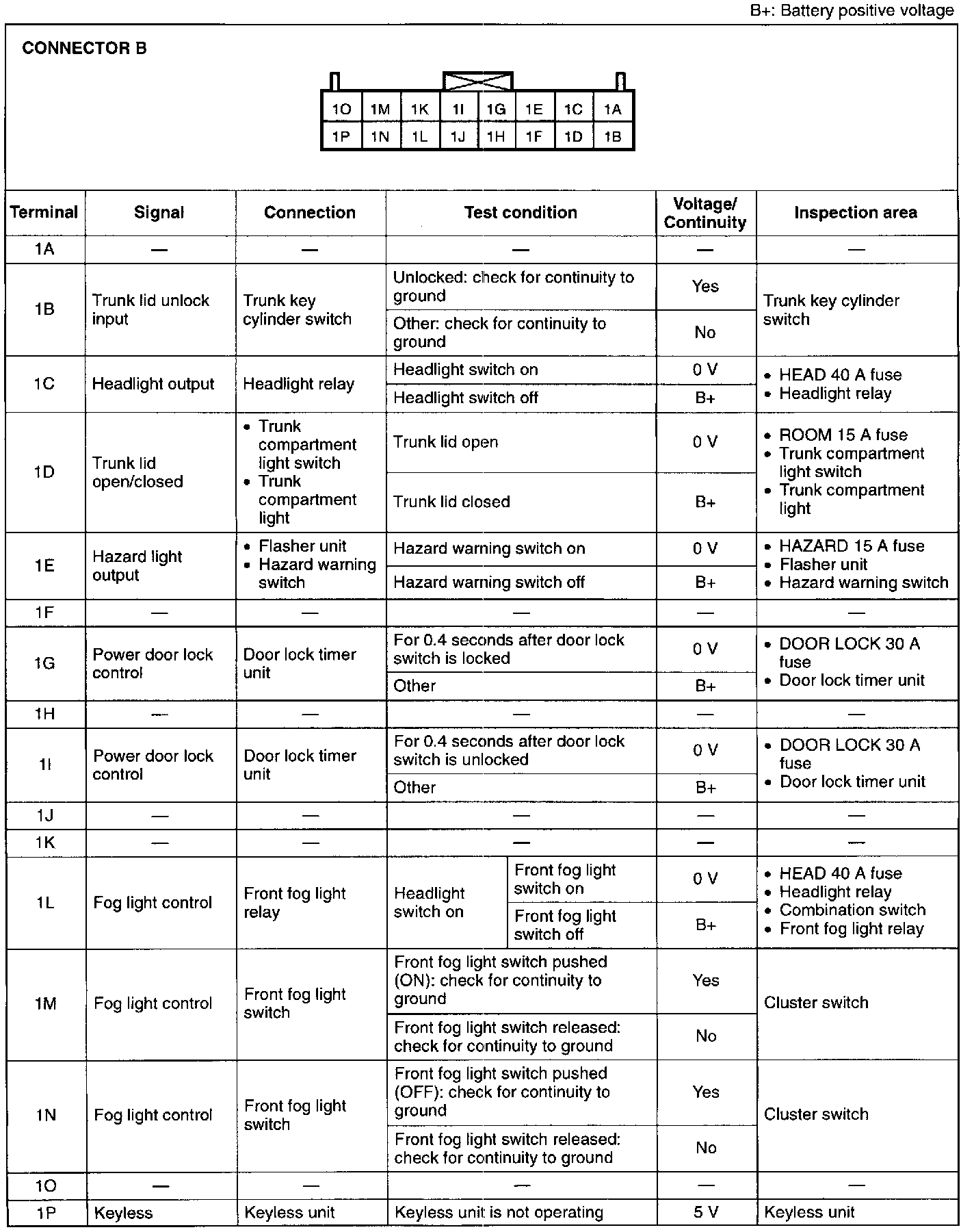 4. If riot as specified, inspect the parts listed under "Inspection area" and the related wiring harnesses.