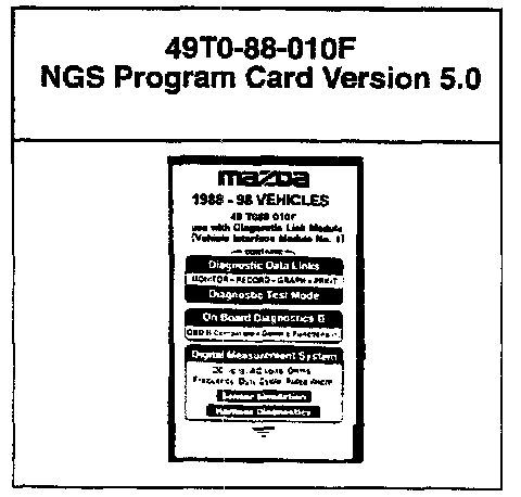 Per Service Bulletin Cat. ST 004/97, issued 10/10/97, your service department currently has two reprogrammable New Generation Star (NGS) cards, an older Version 3.0 program (P/N 49T0-88-010D) and a current Version 4.0 program (P/N 49T0-88-010E). On March 25, 1998, V4.0 will supersede to V5.0 (P/N 49T0-88-010F) as a new Mazda Required Tool (MRT) to properly service MAZDA vehicles.