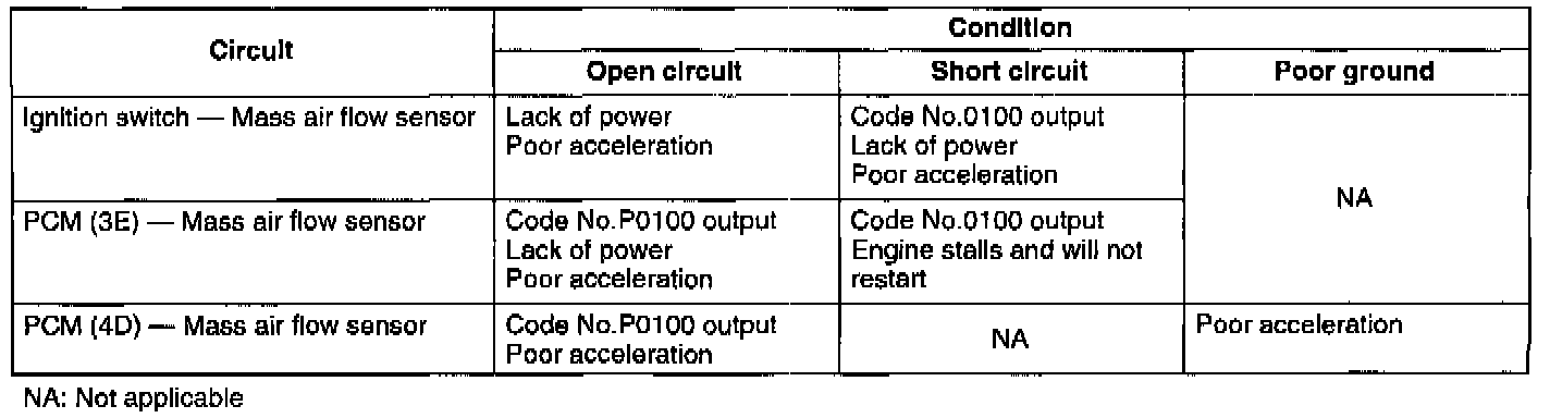 - If the Vs terminal of the mass air flow sensor has a short circuit, diagnostic trouble code No.P0100 will be output, and the throttle position sensor and closed throttle position switch signal will be used to adjust the basic injection amount as to the following three modes.