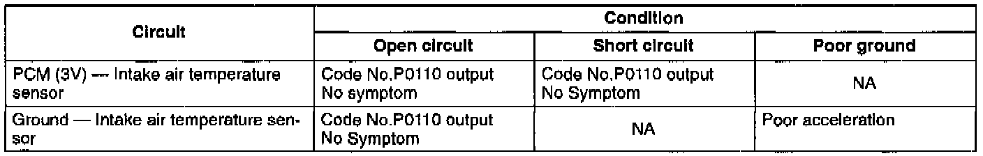 - If the temperature sensor or circuit has an open or short, diagnostic trouble code No.P0110 is output, and the PCM uses a preprogrammed intake-air temperature of 2O°C (68°F).