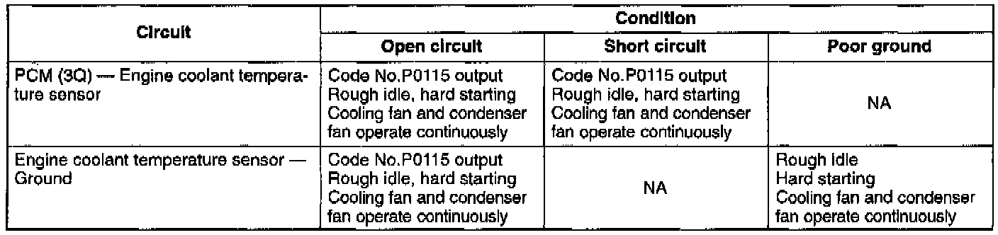 - If the temperature sensor or circuit has an open or short, diagnostic trouble code No.P0115 is output, and the PCM uses a preprogrammed temperature value of 40°C (104°F).