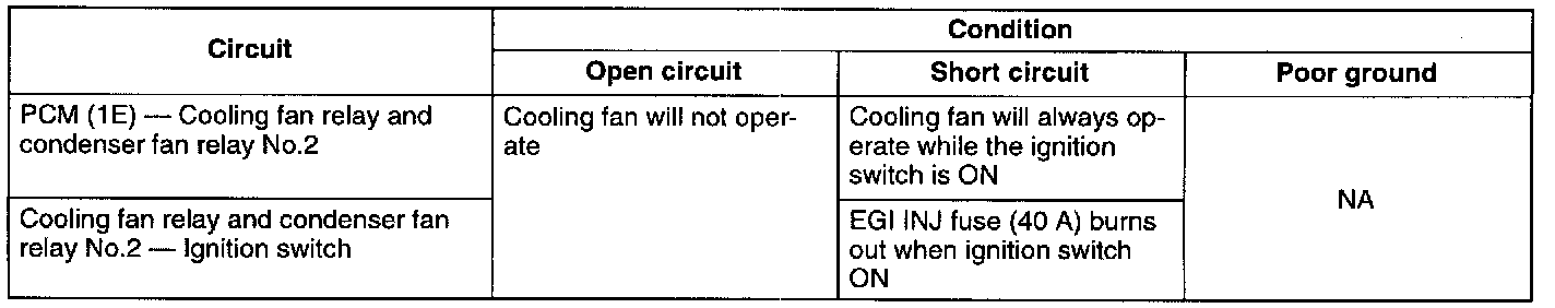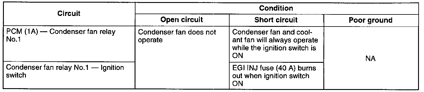 - If the circuit is shorted, the condenser fan and cooling fan will always operate while the ignition switch is ON.