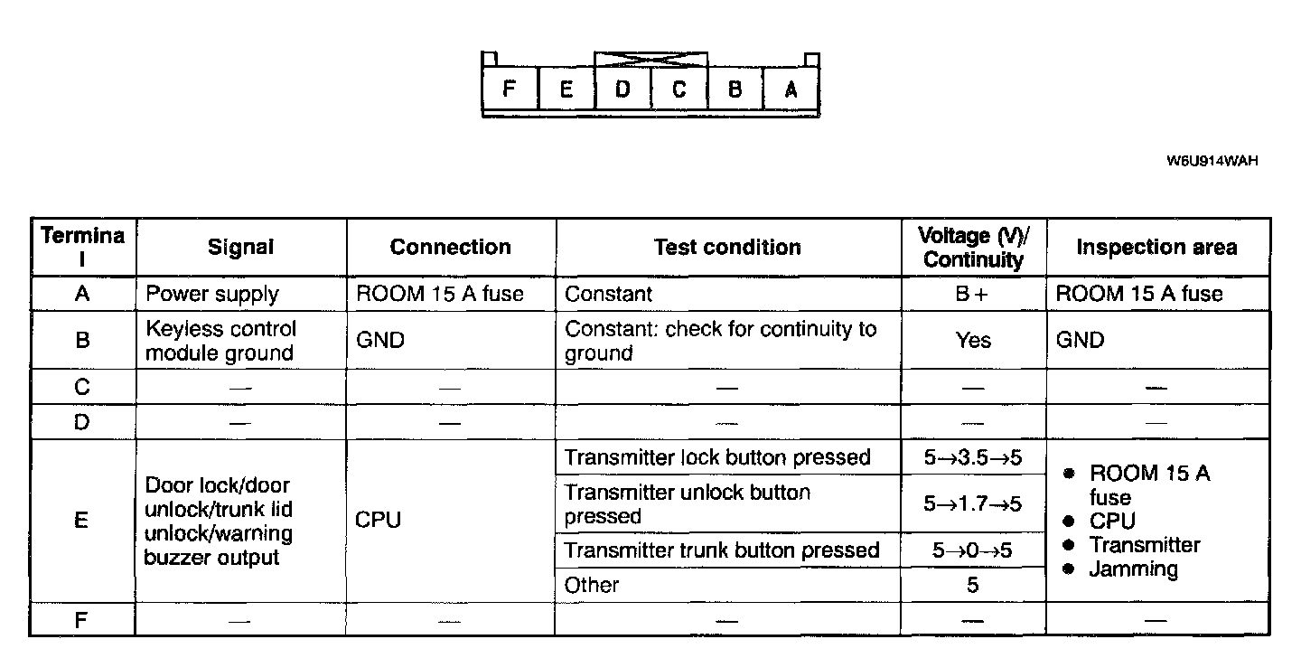 NOTE: Disconnect the keyless control module connector before checking for continuity at terminal B.