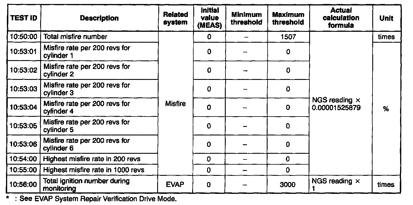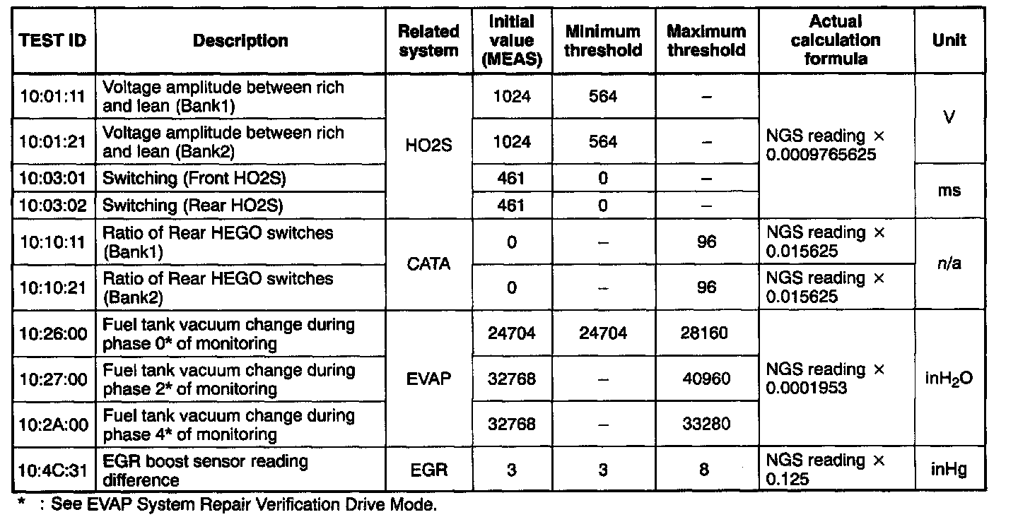 The purpose of this test mode is to confirm the result of OBD-II monitor diagnostic test results. The result values stored when particular monitor is completed are displayed. If the monitor is not completed, initial value is displayed.