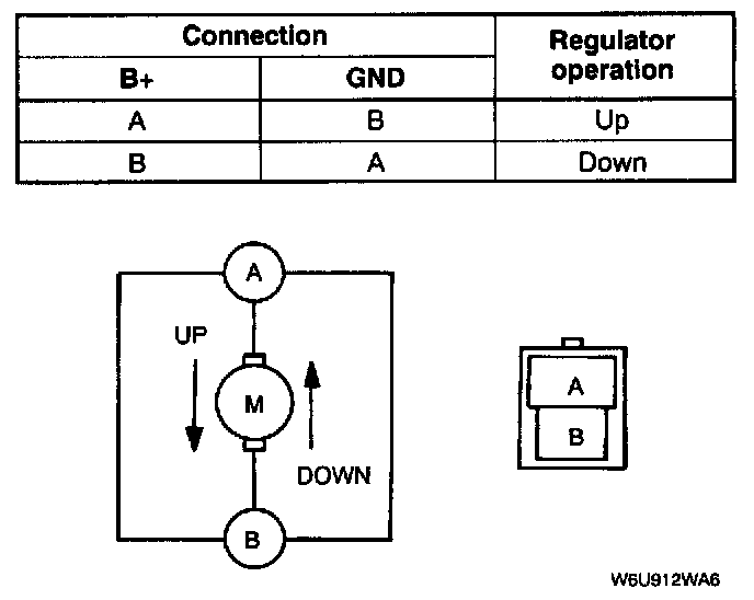 5. Apply battery positive voltage to the rear power window regulator terminals and check the operation of the rear power window regulator.