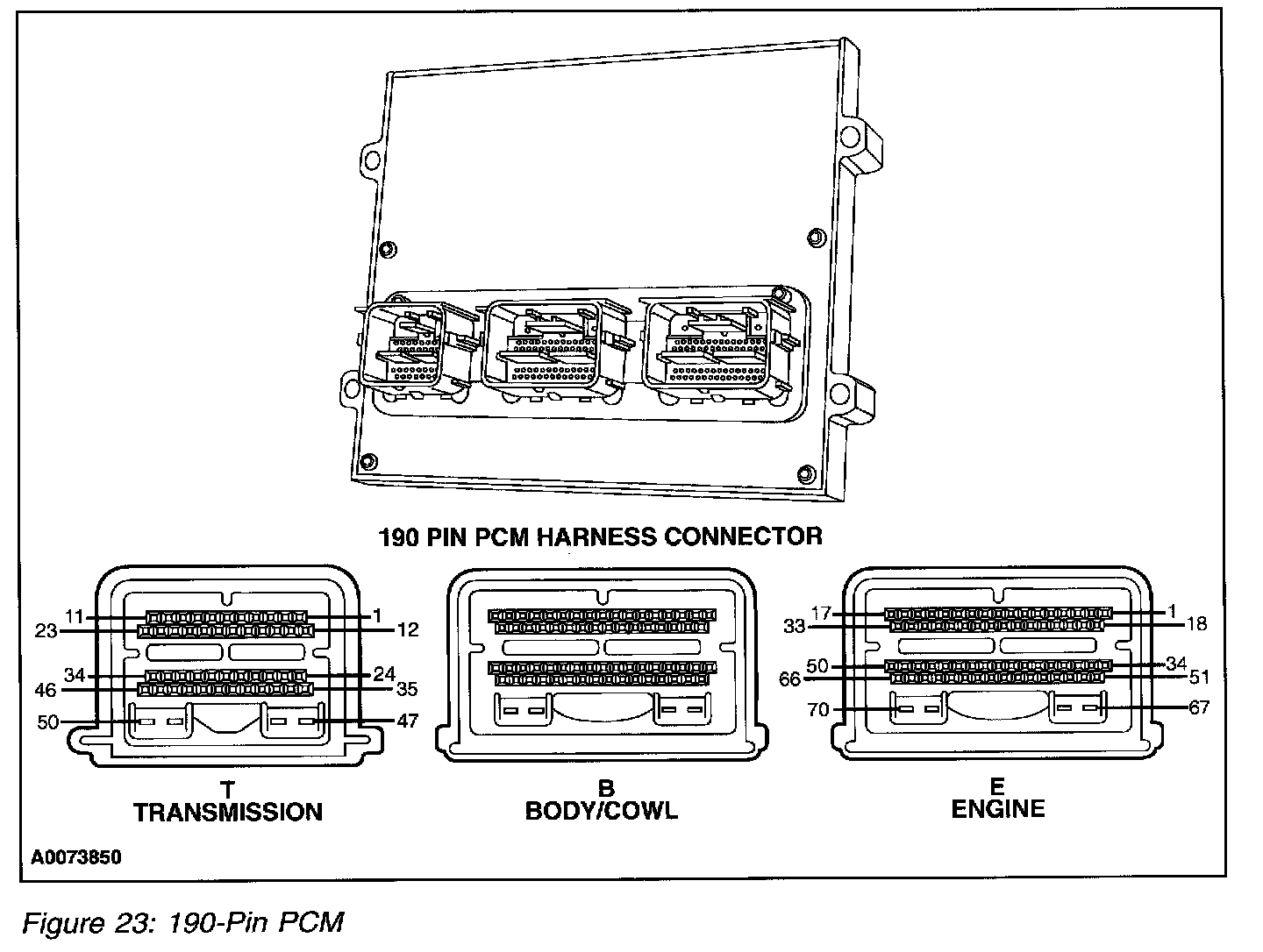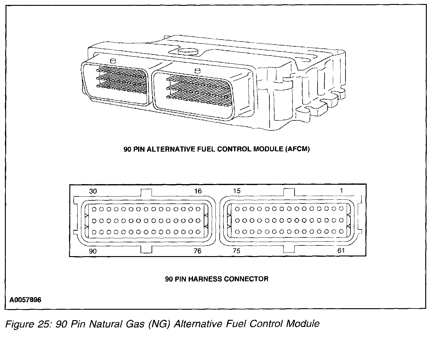 The natural gas (NG) vehicle module (Figure 24) provides two functions. The first function operates the fuel injectors and is referred to as the injector driver module (IDM). The second function sends a fuel level indicator signal to drive the fuel gauge and is called the fuel indicator module (FIM). IDM NG vehicle fuel indicator driver signals are based on powertrain control module (PCM) fuel injector driver signals and are controlled directly by the corresponding injector drivers in the PCM. The IDM must be used to provide the NG fuel injectors with the required high current necessary for proper operation. The greater demand of NG fuel injector current warrants an increased size of the injector driver and increased heat dissipation. Given these conditions, the PCM would not be suitable for placement of these drivers. The IDM closely resembles the Electronic Engine Control 60 Pin PCM module in appearance. This style of module is used on the NG F-Series and Crown Victoria, while a 90 pin Alternative Fuel Control Module (AFCM) (Figure 25) is used on the E-Series.