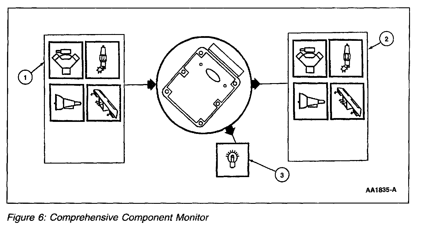 The Comprehensive Component Monitor (CCM) monitors for malfunctions in any powertrain electronic component or circuit that provides input or output signals to the PCM that can affect emissions and is not monitored by another OBD II monitor. Inputs and outputs are, at a minimum, monitored for circuit continuity or proper range of values. Where feasible, inputs are also checked for rationality, outputs are also checked for proper functionality.