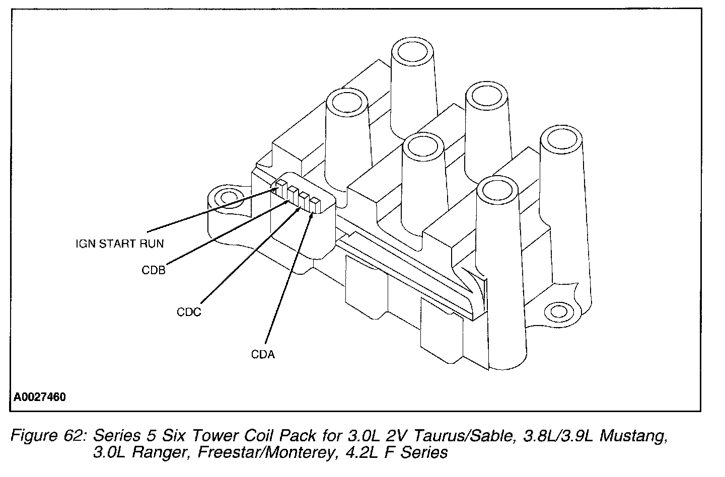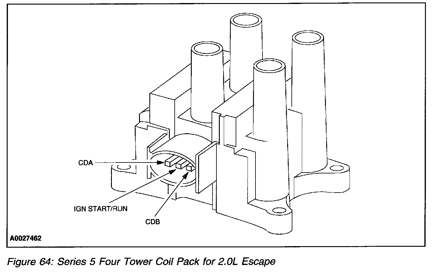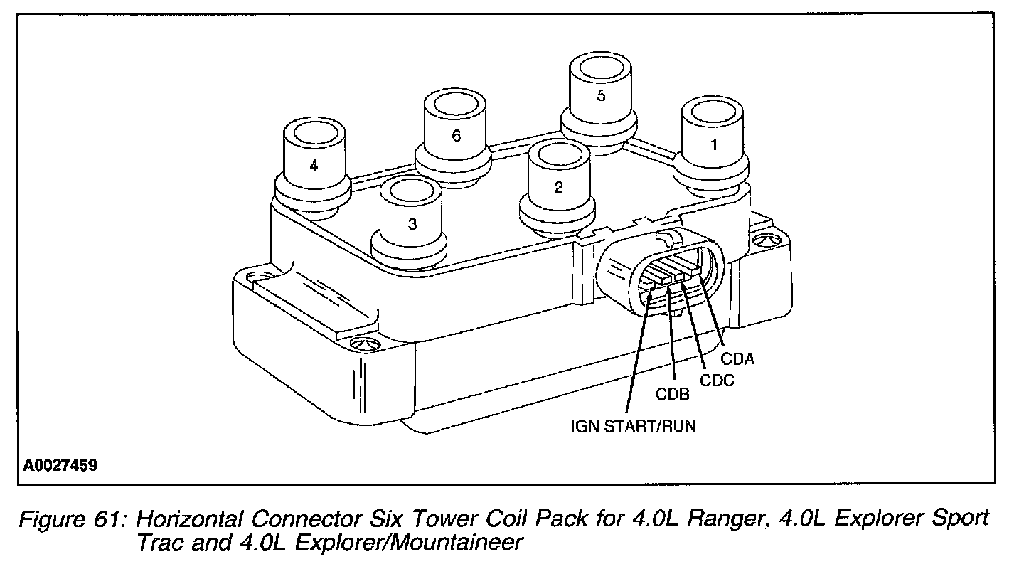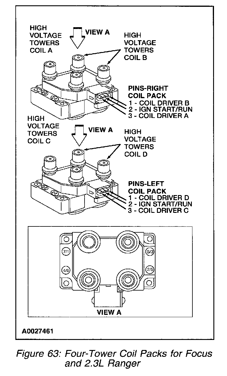 Coil packs come in four tower, Series 5 four tower, six-tower horizontal connector and Series 5 Six tower models. Two adjacent coil towers share a common coil and are called a matched pair. For six-tower coil pack (six cylinder) applications the matched pairs are 1 and 5, 2 and 6, and 3 and 4 (Figure 61) and (Figure 62). For four-tower coil pack (four cylinder) applications the matched pairs are 1 and 4, and 2 and 3 (Figure 63) and (Figure 64).