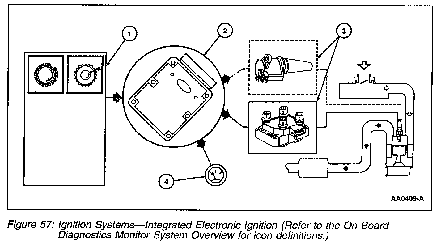 The Integrated Electronic Ignition (EI) system consists of a crankshaft position (CKP) sensor, coil pack(s), connecting wiring, and PCM. The Coil On Plug (COP) Integrated EI System uses a separate coil per spark plug and each coil is mounted directly onto the plug. The COP Integrated EI System eliminates the need for spark plug wires but does require input from the camshaft position (CMP) sensor. Operation of the components are as follows (Figure 57):