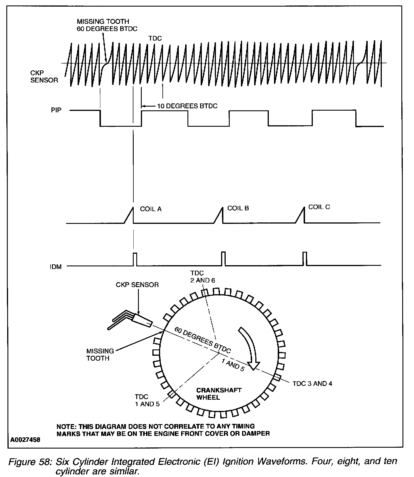 2. The PCM uses the CKP signal to calculate a spark target and then fires the coil pack(s) to that target shown (Figure 58). The PCM uses the CMP sensor not shown in Figure 58 on COP Integrated EI Systems to identify top dead center of compression of cylinder 1 to synchronize the firing of the individual coils.