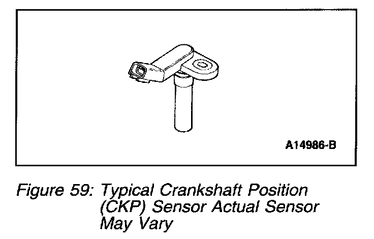 The crankshaft position (CKP) sensor (Figure 59) is a magnetic transducer mounted on the engine block adjacent to a pulse wheel located on the crankshaft. By monitoring the crankshaft mounted pulse wheel, the CKP is the primary sensor for ignition information to the PCM. The pulse wheel has a total of 35 teeth spaced 10 degrees apart with one empty space for a missing tooth. The 6.8L ten cylinder pulse wheel has 39 teeth spaced 9 degrees apart and one 9 degree empty space for a missing tooth. By monitoring the pulse wheel, the CKP sensor signal indicates crankshaft position and speed information to the PCM. By monitoring the missing tooth, the CKP sensor is also able to identify piston travel in order to synchronize the ignition system and provide a way of tracking the angular position of the crankshaft relative to a fixed reference (Figure 57) for the CKP sensor configuration. The PCM also uses the CKP signal to determine if a misfire has occurred by measuring rapid decelerations between teeth.