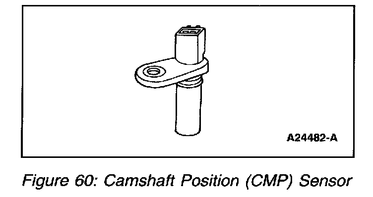The camshaft position sensor (Figure 60) used by COP Integrated EI system is a magnetic transducer mounted on the engine front cover adjacent to the camshaft. By monitoring a target on the camshaft sprocket, the CMP sensor identifies cylinder one to the PCM. The COP Integrated EI system uses this information to synchronize the firing of the individual coils.