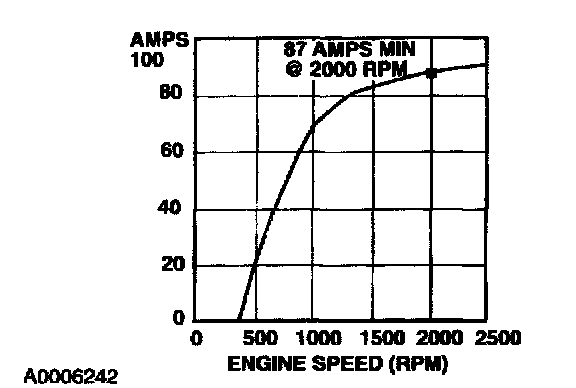 4. With the engine running at approximately 2,000 rpm, adjust the tester load bank to determine the output of the generator. Generator output should be greater than the graph shown. If not, refer back to the pinpoint test or Go to Symptom Chart. Pinpoint Tests Symptom Related Diagnostic Procedures