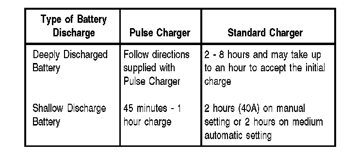 BATTERY CHARGERS HAVE IMPROVED GREATLY WITH THE ADDITION OF THE NEW GENERATION OF "PULSE CHARGERS". THESE NEW CHARGERS PULSE CURRENT INTO THE BATTERY THAT BREAKS DOWN THE SULFATION LAYER ON THE BATTERY PLATES AND GENERALLY REDUCE CHARGING TIMES TO LESS THAN 1 HOUR.