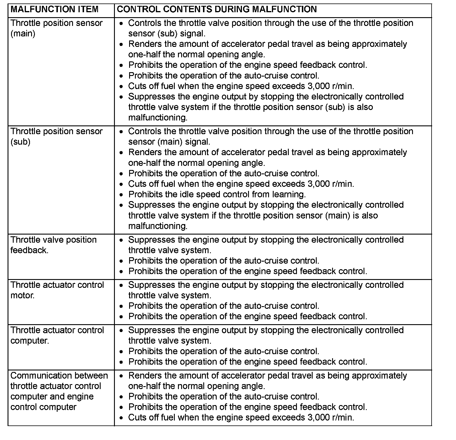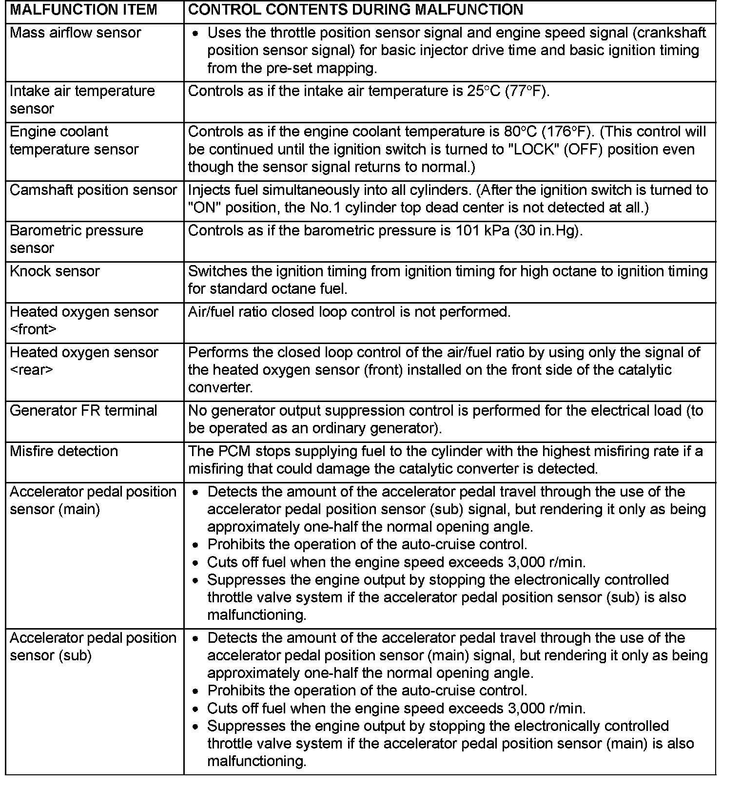 When the main sensor malfunctions are detected by the diagnostic test mode, the vehicle is controlled by means of the given defaults.