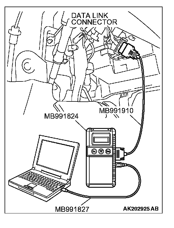 CAUTION: To prevent damage to scan tool MB991958, always turn the ignition switch to the "LOCK" (OFF) position before connecting or disconnecting scan tool MB991958.
