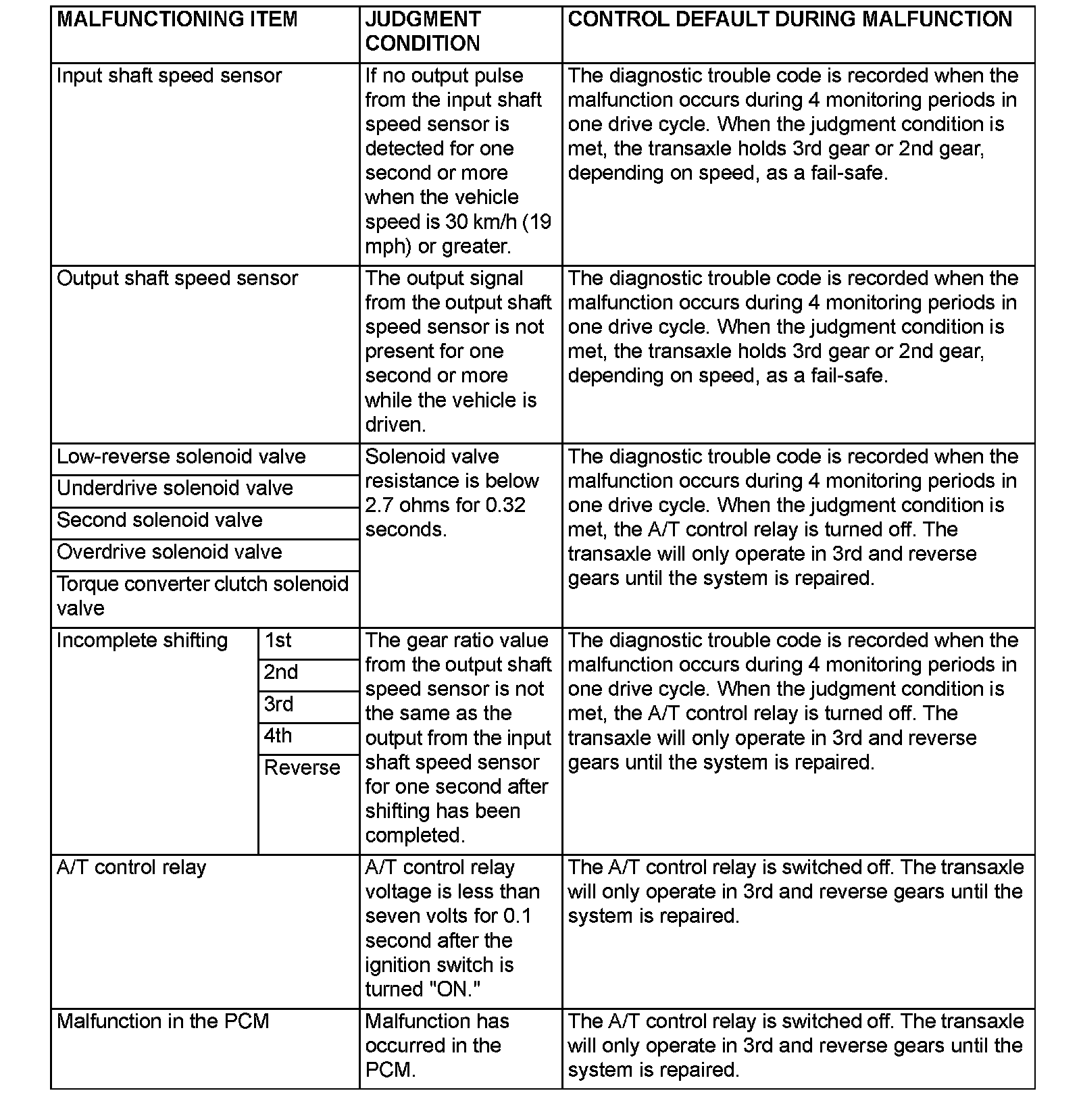 When a malfunction of a main sensor or actuator is detected by the PCM, the transaxle is controlled by preset control logic to maintain safe conditions for driving.