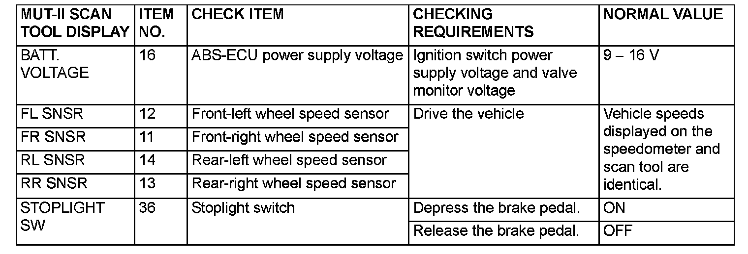 The following items can be read by the scan tool from the ABS-ECU input data.