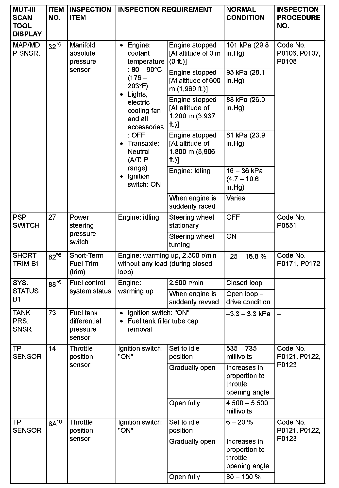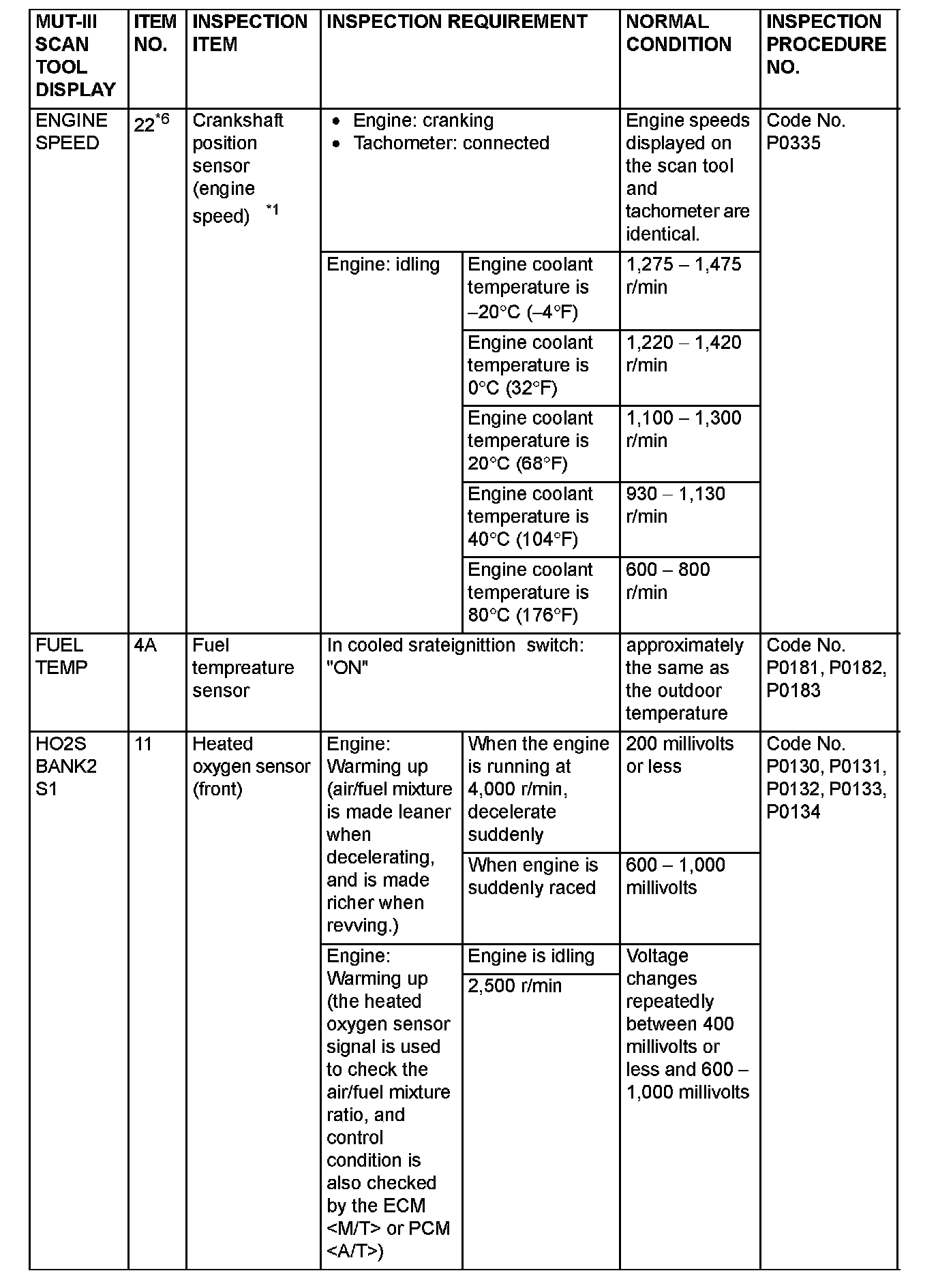 *6: GST items. [Data list items consist of MUT-III items and GST items. GST items can be accessed through the use of a general scan tool (GST). When scan tool MB991958 (MUT-III sub assembly) is used, MUT-III items appear alphabetically; then, GST items appear alphabetically. The black and white characters of the GST items are inverted from the MUT-III items.]
