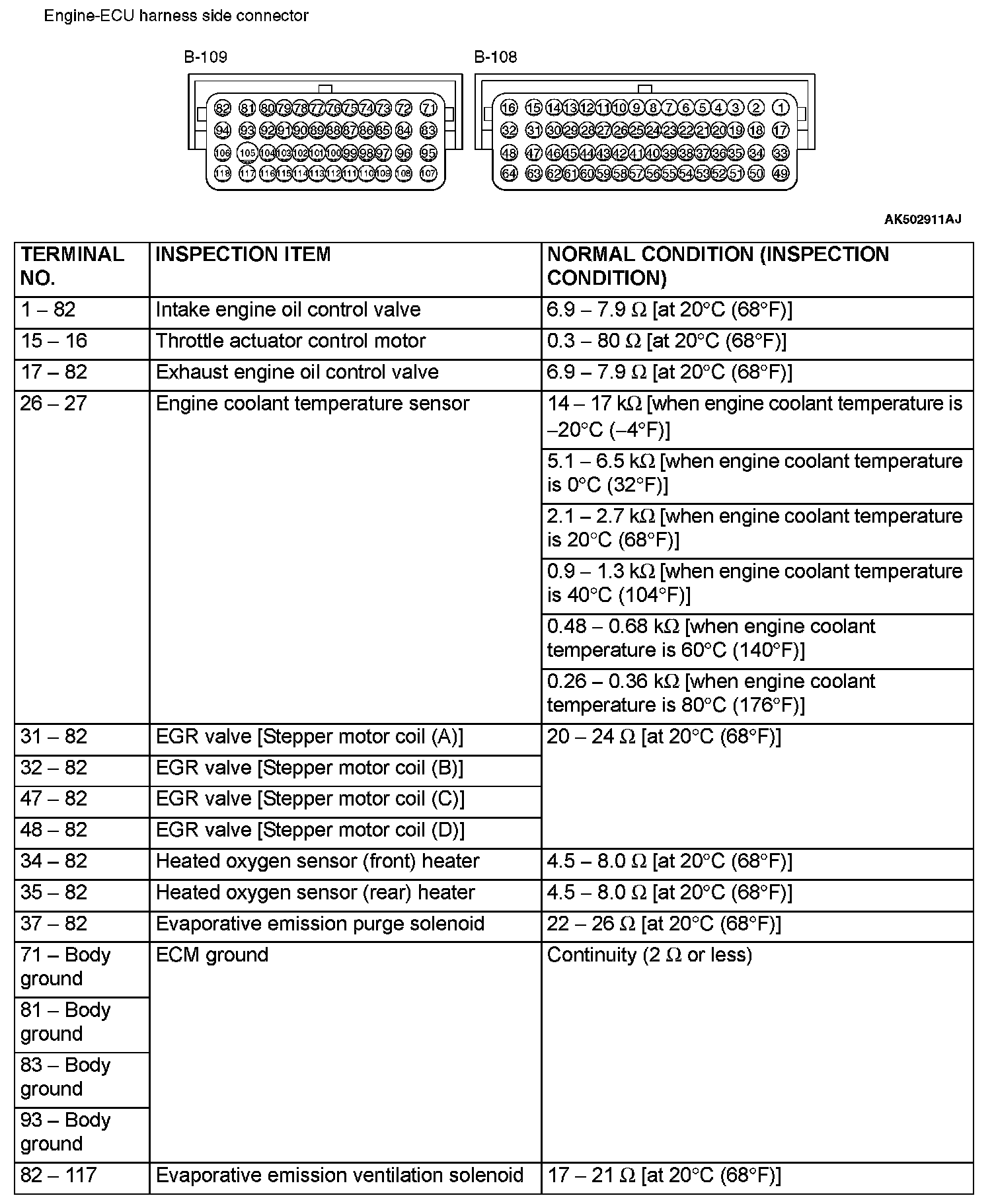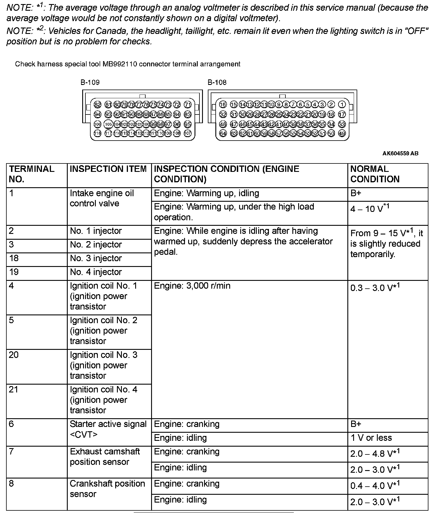 1. Disconnect the ECM connectors B-108 and B-109, and connect check harness special tool MB992110 between the ECM connectors.