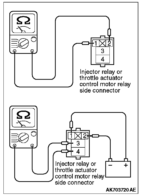 Inspect the Injector relay and throttle actuator control motor relay for continuity in accordance with the chart shown below.