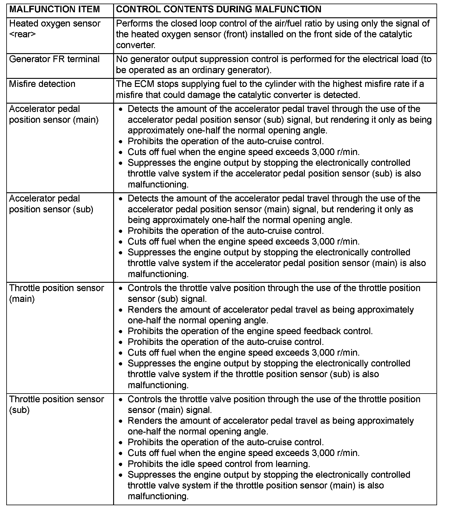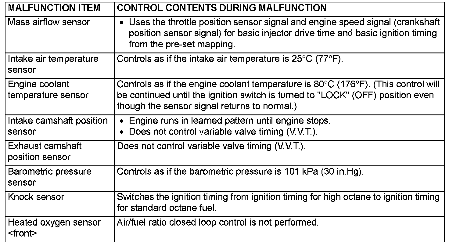 When the main sensor malfunctions are detected by the diagnostic test mode, the vehicle is controlled by means of the following defaults.