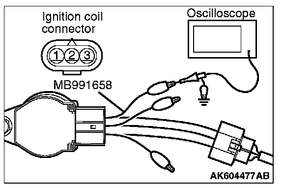1. Disconnect the ignition coil connector, and connect test harness special tool (MB991658) between the separated connector. (All terminals should be connected.)
