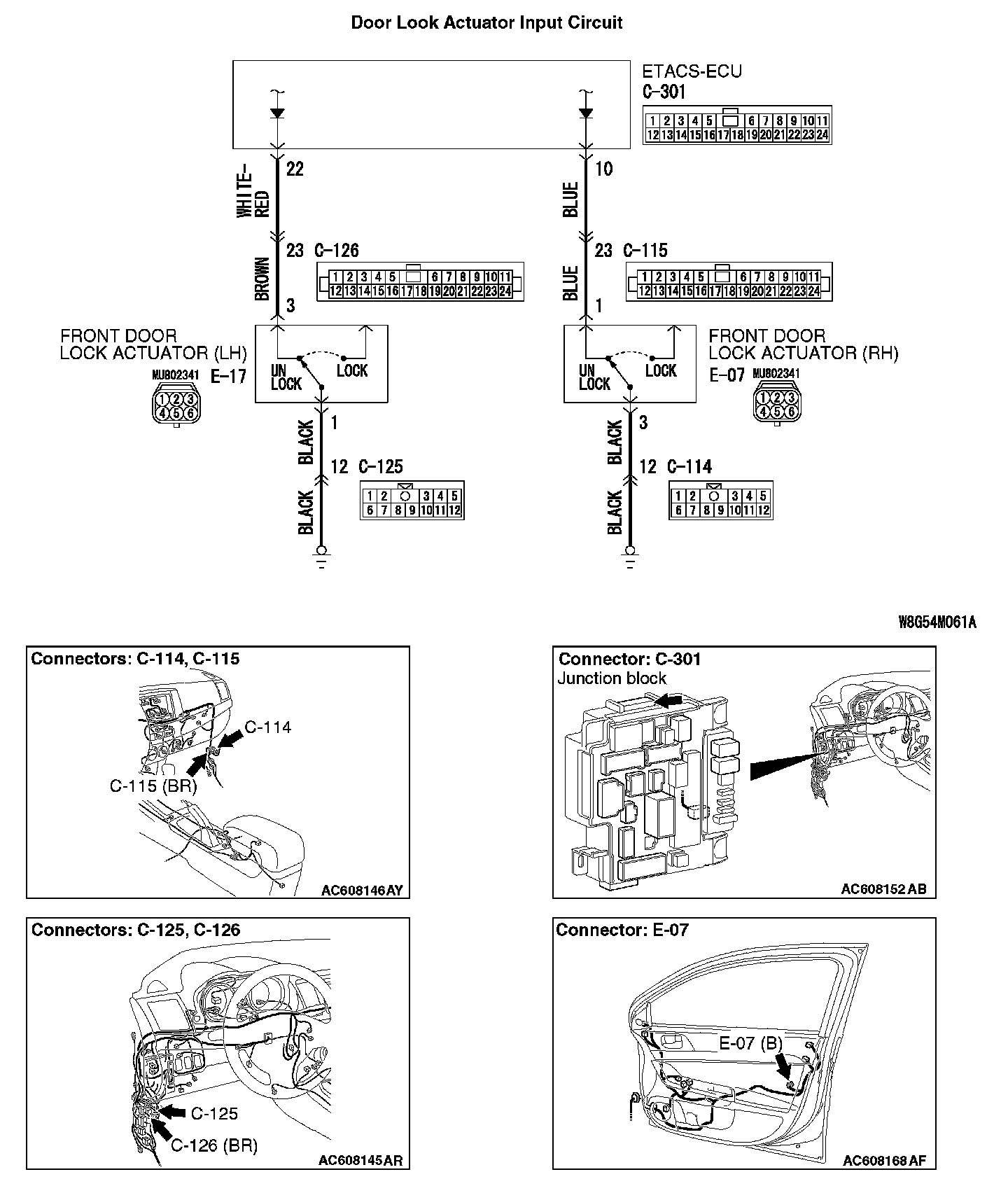 STEP 7. Check the wiring harness between front door lock actuator (LH) connector E-17 (terminal 3) and ETACS-ECU connector C-301 (terminal 22).