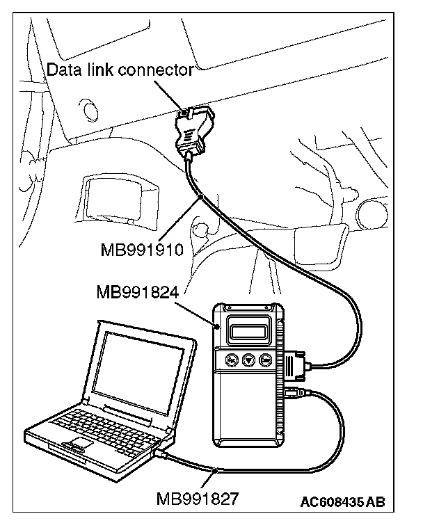 1. Connect scan tool MB991958. Refer to "How to connect the Scan Tool (M.U.T.-III)." How to Connect the Scan Tool (M.U.T.-III)