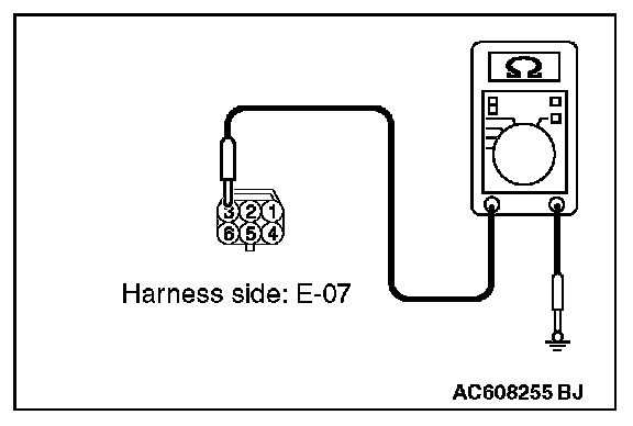 Disconnect front door lock actuator (RH) connector E-07. Then check continuity between the terminals.