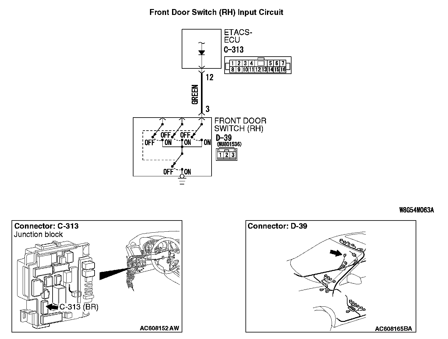 STEP 5. Check the wiring harness between front door switch (RH) connector D-39 (terminal 3) and ETACS-ECU connector C-313 (terminal 12).