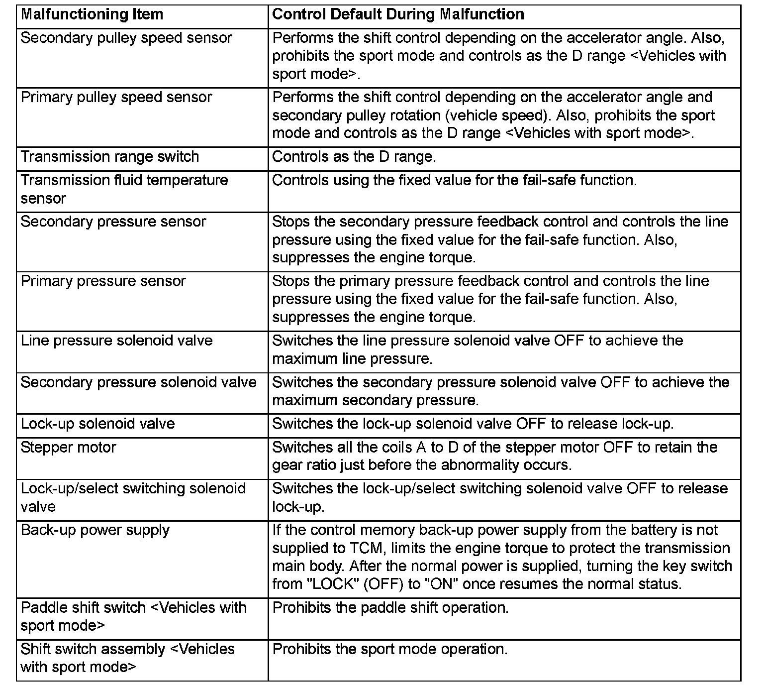 If abnormality occurs in signals from various sensors, switches, or solenoids, this function allows controlling them with the minimum adverse effect to the driving performance. The following shows the fail-safe controls when an abnormal signal is input to TCM from each sensor.