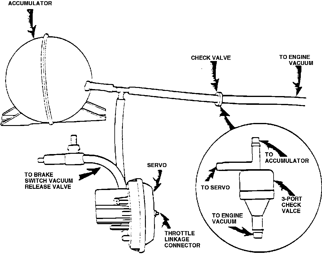 The vacuum accumulator, Fig. 1, is attached to the intake manifold through a check valve. The accumulator stores the high vacuum available during periods of low engine loading. The system operates on accumulator vacuum, which is normally higher than manifold vacuum. Manifold vacuum exceeds accumulator vacuum only when being charged by a high engine vacuum condition.