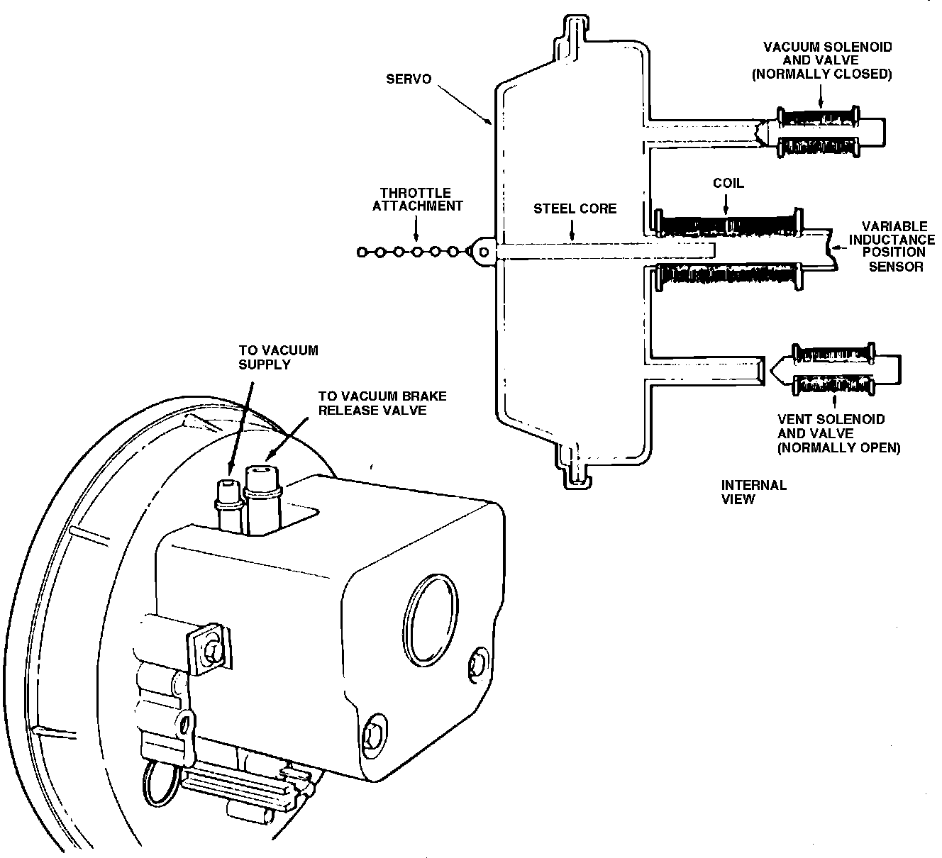 This system is used on all 1984---87 models except Cadillac. The system consists of a mode control assembly, electronic controller (module), Vehicle Speed Sensor (VSS) buffer amplifier, servo unit, and release switches and valves. The servo unit maintains vehicle speed (throttle position) by trapping vacuum in its diaphragm chamber at servo positions determined by the control module. The module monitors mode control switch position, signals from the VSS buffer amplifier, servo position and release switch operation, then operates vacuum valves within the servo unit to control servo operation and vehicle speed. The module also contains a speed limiting function which prevents system operation at speeds below approximately 25 mph.